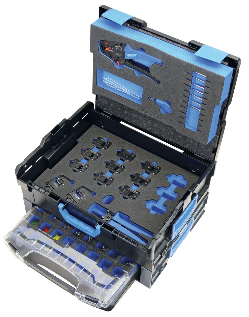 ENTRIEGELN, ABISOLIEREN und CRIMPEN, alles griffbereit untergebracht in einem übersichtlichen Koffersystem., Entwickelt für schnelle, organisierte und effiziente Instandsetzungsarbeiten im Werkstattalltag., Defekte, oxidierte oder provisorisch instandgesetzte Kabel-/Steckverbindungen können zu schwerwiegenden Systemausfällen am Fahrzeug führen., Hierfür bietet speziell der Reparatur-Satz für den Profi ein umfangreiches und robustes Меню zum schnellen und fachgerechten Instandsetzen nahezu aller gängigen Kabel-/Steckverbindungen am Fahrzeug., Durch das einzigartige und kompakte Basiswerkzeug/Wechseleinsatzsystem kann dieser auch in Zukunft beliebig erweitert werden., Im Lieferumfang ist bereits ein großzügiges Меню der gängigsten Kontakte und Abdichtungen enthalten., ENTRIEGELN: Entriegelungswerkzeug mit passenden Wechseleinsätzen für ein beschädigungsfreies Herauslösen unterschiedlichster Kabel-/Steckverbindungen aus dem Steckergehäuse., ABISOLIEREN: Abisolierwerkzeug mit rasiermesserscharfen Wechseleinsätzen für ein exaktes Abisolieren, speziell auch für Kabel mit extrem rutschiger PVC Isolation., CRIMPEN: Crimpwerkzeug mit Wechseleinsätzen für ein perfektes Crimpergebnis wie ab Werk, garantiert durch die speziellen Kabel-/Steck-Positionierer., Dabei lässt sich das Werkzeug erst wieder öffnen, wenn der für den Crimpvorgang nötige Druck vollständig aufgebracht wurde.