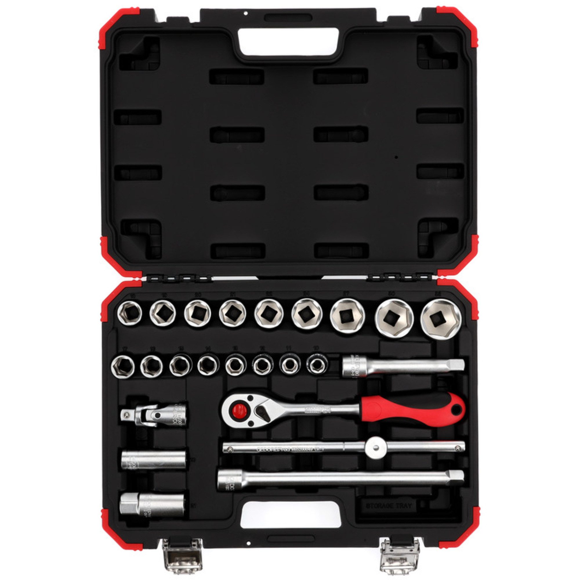 mit Umschalt-Knarre, SW 10mm - 32mm Der Steckschlüssel-Satz R69003024 im GEDORE red Design enthält 24 klemmgesicherte Werkzeuge, darunter eine Hebel-Umschaltknarre mit Kugelsicherung, Steckschlüsseleinsätze, zwei Zündkerzenschlüssel mit eingepresstem Haltegummi, verschiedene Verlängerungen und Adapter. Er eignet sich für handbetätigte Schraubfälle. Die Werkzeuge sind aus Chrom-Vanadium-Stahl gefertigt und matt satiniert verchromt. Die 2K-Umschaltknarre bietet einen Rechts-/Linkslauf (durch Hebel umschaltbar) und eine Druckknopfauslösung. Sie ist feinverzahnt mit 72 Zähnen, hat einen Rückholwinkel von 5°, einen ovalen Kopf und einen 2-Komponenten-Griff.