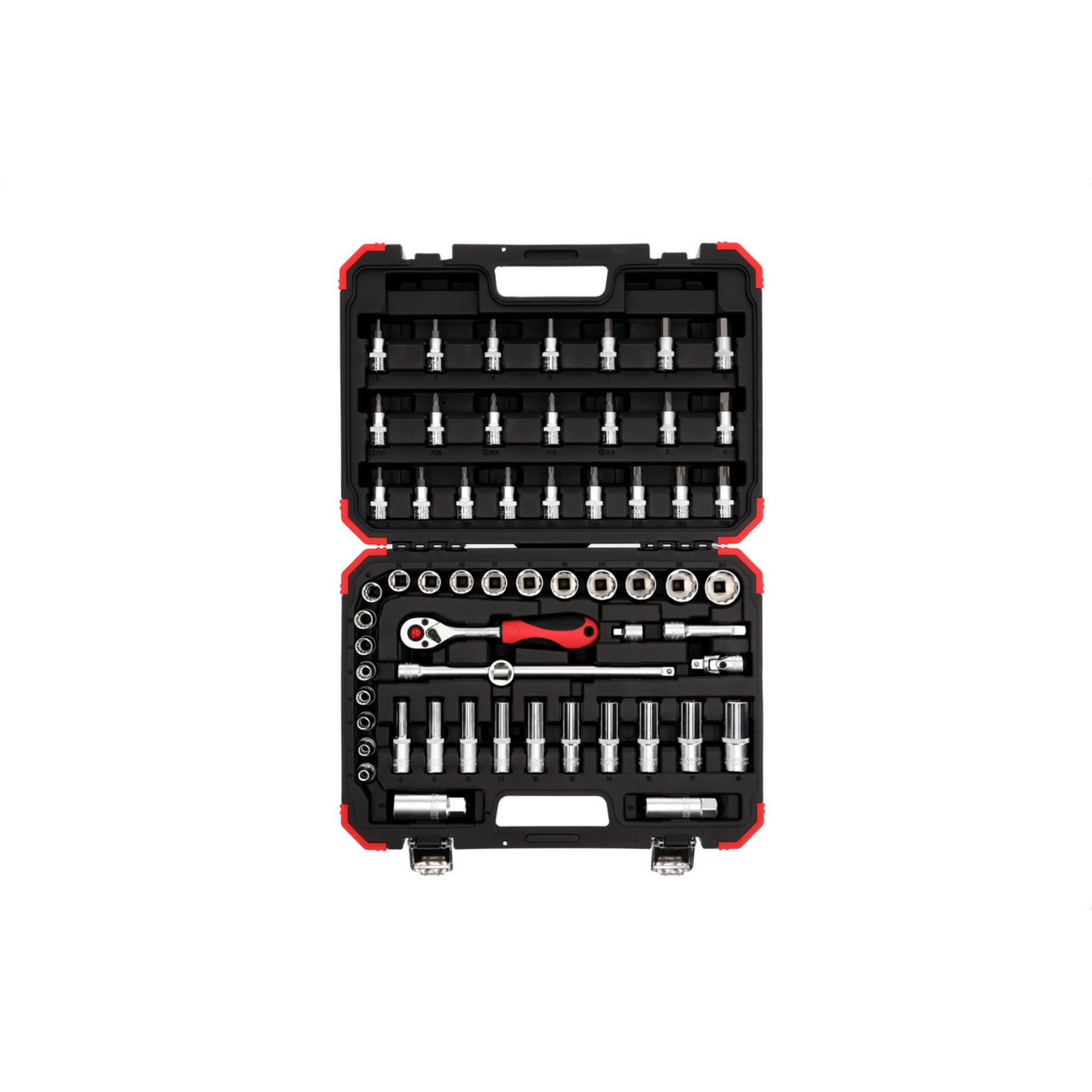 mit Umschalt-Knarre, SW 6mm - 24mm Der Steckschlüssel-Satz R59003059 im GEDORE red Design enthält 59 klemmgesicherte Werkzeuge, darunter eine Hebel-Umschaltknarre, 2 Zündkerzenschlüssel, verschiedene Verlängerungen und Adapter. Er eignet sich für handbetätigte Schraubfälle. Die Zündkerzeneinsätze haben einen eingepressten Haltegummi und einen zusätzlichem Antriebs-6-kant (SW 19/22). Die Werkzeuge sind aus Chrom-Vanadium-Stahl gefertigt und matt satiniert verchromt. Die 2K-Umschaltknarre bietet einen Rechts-/Linkslauf (durch Hebel umschaltbar) und eine Druckknopfauslösung. Sie ist feinverzahnt mit 72 Zähnen, hat einen Rückholwinkel von 5°, einen ovalen Kopf und einen 2-Komponenten-Griff.