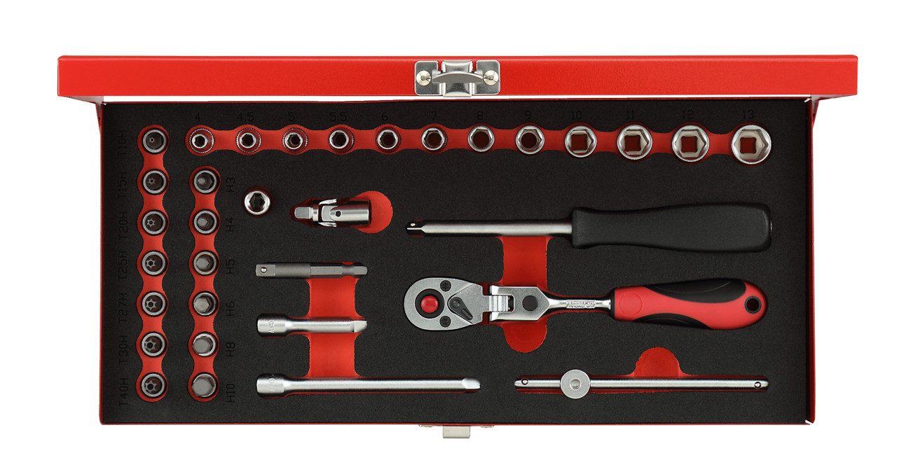 Verbindungsvierkant nach DIN 3120 - A 6,3, ISO 1174, mit Kugelarretierung, Innenvierkantantrieb nach DIN 3120 - C 6,3, ISO 1174, mit Kugelfangrille, 2K-Gelenk-Umschaltknarre 1/4", Rechts-/Linkslauf durch Hebel umschaltbar, Druckknopfauslösung, feinverzahnt, Ovaler Kopf, 2-Komponenten-Griff, handschonende Kraftübertragung, für Steckschlüsseleinsätze, Vierkantsteckgriff 1/4", 1-Komponenten-Griff mit Innenvierkant, Steckschlüsseleinsatz 1/4", 6-kant, metrisch, kurz, Ausführung nach DIN 3124, ISO 2725, Schraubendrehereinsatz 1/4", für Innen-6-kant-Schrauben, mit eingepresstem, phosphatierten Stift, Schraubendrehereinsatz 1/4", TX mit Bohrung, mit eingepresstem, phosphatierten Stift, Steckschlüsselverlängerung 1/4", Quergriff mit Gleitstück 1/4", Ausführung nach DIN 3122, ISO 3315, Kardangelenk 1/4", Gelenk verschraubt, Ausführung nach DIN 3123 - C 6,3, Antriebsadapter 1/4", zum Antrieb von Steckschlüssel- und Schraubendrehereinsätzen, Bit-Adapter 1/4", mit Innensechskant und Innenvierkant, für alle Bits und Werkzeuge mit 1/4" Außensechskant, Chrom-Vanadium-Stahl, matt satiniert verchromt, Für handbetätigte Schraubfälle, Roter Stahlblechkoffer mit Schaumstoffeinlage
