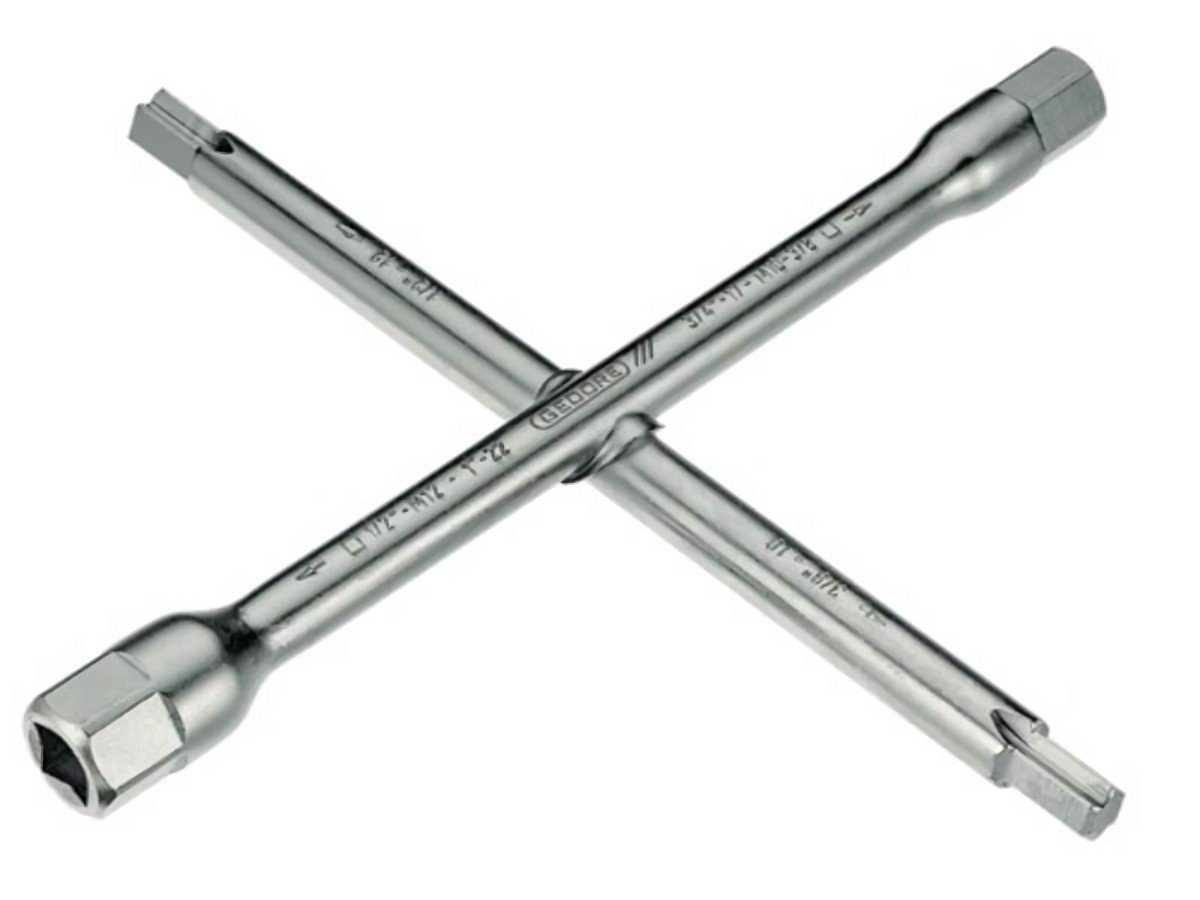 Sanitärkreuzschlüssel 378500 220x220mm 14-Fach-Funktion GEDORE mit 14 Funktionen · für Hahnverlängerungen 9,5 mm (3/8''), 12,7 mm (1/2''), 19,1 mm (3/4'') und 25,4 mm (1''), für Stockschrauben M6, M8, M10, M12 sowie für Rohrstopfen 9,5 mm (3/8'') und 12,7 mm (1/2'') · Sechskantmitnahme SW 17, SW 22 · Doppelnutmitnahme · ve
