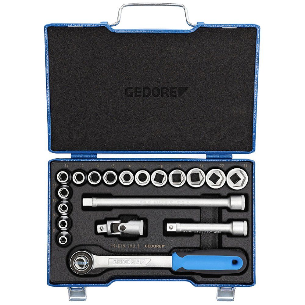 Steckschlüsselsatz mit geschmiedeten, vergüteten, handbetätigten 6-kant UD-Profil Steckschlüsseleinsätzen. Betätigungswerkzeuge aus GEDORE Vanadium-Stahl 31CrV3. Inkl. robuster Hebel-Umschaltknarre, mit Druckknopfauslösung