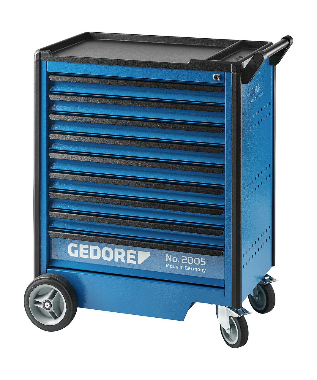 Korpus: Abmessungen: H 1020 x B 865 x T 605 mm, Ablageplatte aus ABS-Kunststoff mit Kleinteilefach, Wendig und leicht zu steuern durch Fahr-Lenk-Griff, Seitenwände mit Euro-Lochung 10 x 38 mm zur Befestigung von Haken und Werkzeugen, Sicherheit durch Fersenschutz und Kanten-Rammschutz für Personen und Umfeld, Stahlblech, korrosionsbeständig und kratzfest pulverbeschichtet, GEDORE blau, Schubladen: Zentralverriegelung mit Zylinderschloss, Breite Schubladen (B 640 x T 400 mm) mit Vollauszug, herausnehmbar, Sicherheitsverriegelung je Schublade, Einhandbedienung, Kugelgelagerte Führungsschienen, Individuell bestückbar durch Längs- und Querteiler (auch einzeln lieferbar), Tragfähigkeit pro Schublade 40 kg, untere Schwerlastschublade 60 kg, Stahlblech, korrosionsbeständig und kratzfest pulverbeschichtet, GEDORE blau, GEDORE Hochleistungs-Fahrwerk: Gesamttragkraft 1000 kg statisch (750 kg dynamisch), 2 rollengelagerte GEDORE Hochleistungsräder (Bockrollen Ø 200 mm), 2 kugelgelagerte GEDORE Leichtlaufräder (Lenkrollen Ø 125 mm), beide mit Totalfeststeller, GEDORE Achskonstruktion bewirkt auch bei maximaler Belastung: Leichtlauf, Wendigkeit und Spurtreue, Zubehör: Längs- (LT) und Querteiler (QT) aus verzinktem Stahlblech (auch einzeln lieferbar), Optionen: Optimal bestückbar durch GEDORE Werkzeugmodule (No. 1500 ES/1500 CT oder 2005 CT), Beliebig erweiterbar durch GEDORE Aufsatztruhen, Rückwände und Werkzeughalter, Впередe Schubladenvarianten auf Anfrage, Sonderfarben und -Ausführungen auf Anfrage, Lieferung ohne Werkzeuge und Zubehör