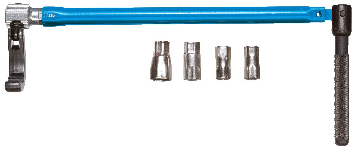 Für Einhebelmischbatterien und Standhähne mit zentraler Verschraubung bis SW 36 mm, Mit 13 mm Sechskantantrieb und zusätzlichen Einsätzen für 9, 10, 11 und 14 mm, Schwenkbare Klaue für Rechts- und Linksgang, Blau lackiert