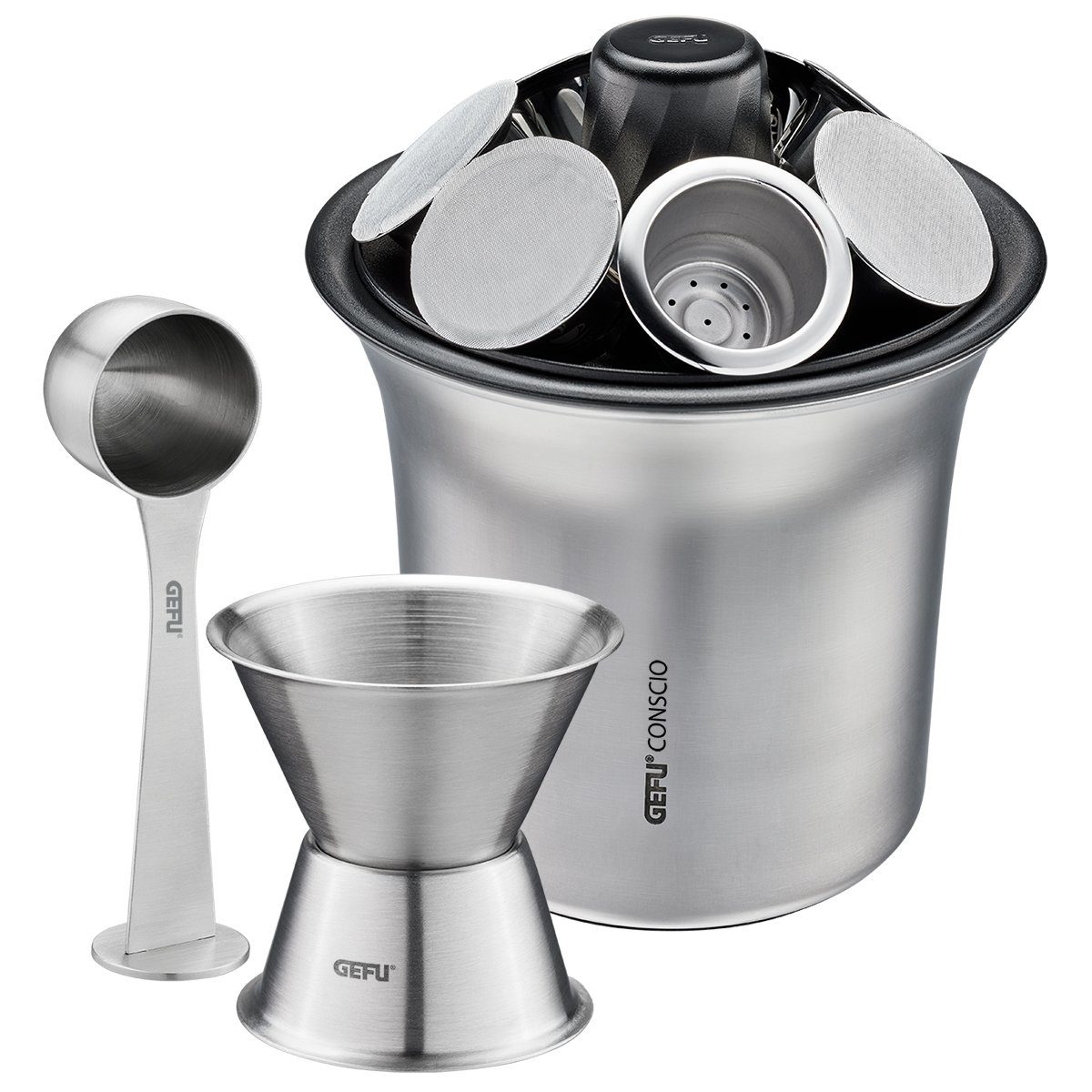 GEFU Wiederbefüllbare Espresso-Kapsel Set: Trichter und Kaffeemaß-Set CONSCIO + 4 Kaffee