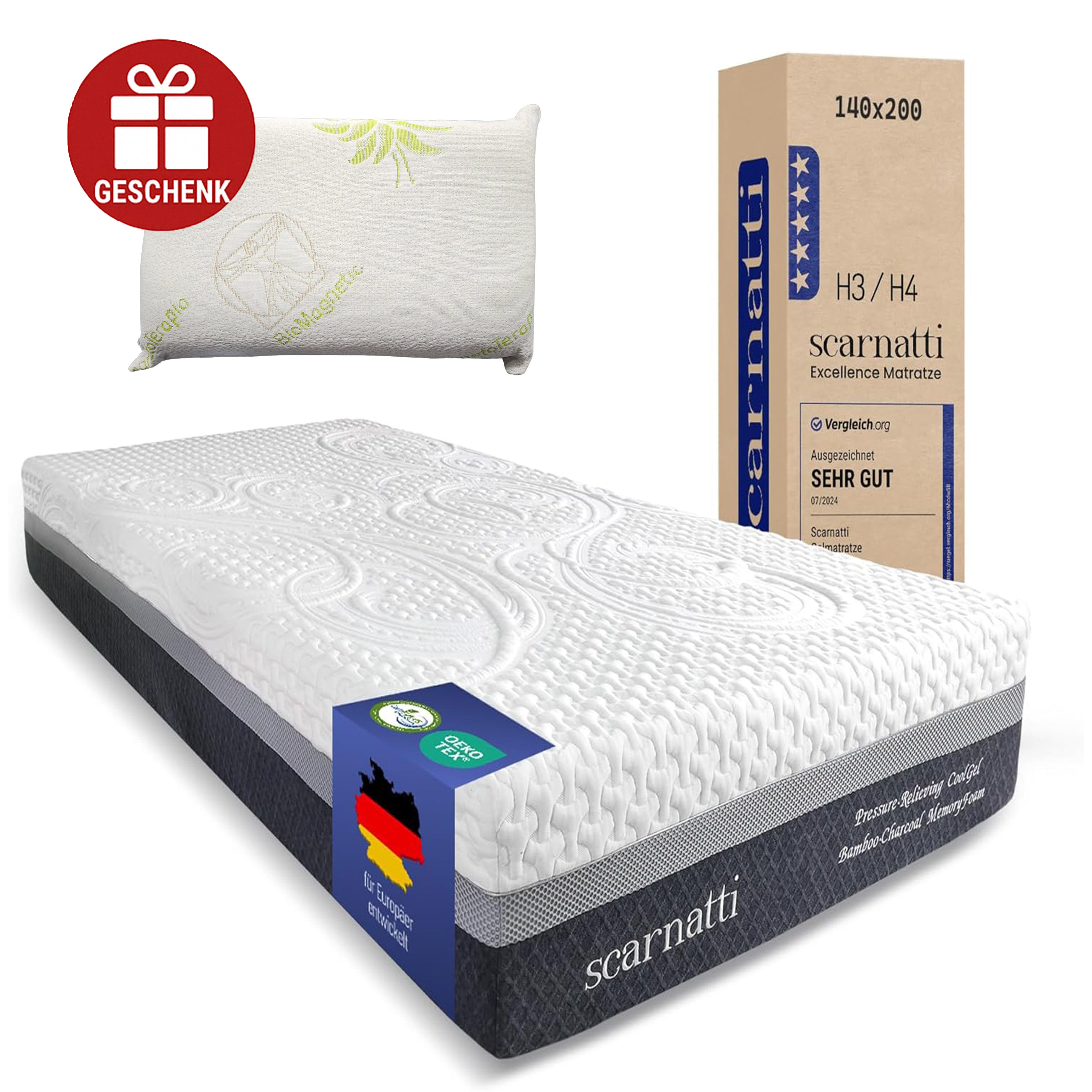 Entdecken Sie den ultimativen Schlafkomfort mit der Scarnatti™ Gel-Memory-Foam-Matratze – wo bahnbrechende Innovation auf höchsten Genuss trifft. Diese Premium-Matratze ist nicht einfach nur eine Schlafunterlage, sondern ein Statement für unvergleichlichen Komfort und modernste Technologie. Schicht 1: Luxuriöser, atmungsaktiver 3D-Premiumbezug Unsere Gel-Memory-Foam-Matratze ist mit einem hochwertigen, atmungsaktiven 3D-Gewebe (500 g/m²) ummantelt, das eine optimale Luftzirkulation ermöglicht und Wärme effektiv verteilt. So bleibt die Oberfläche während der ganzen Nacht angenehm kühl. Der Bezug lässt sich leicht abnehmen und ist bei 30°C maschinenwaschbar, was für maximale Hygiene und einfache Pflege sorgt. Schicht 2: Gel-Memory-Foam-Schicht mit Bambuskohle und CoolGel Die einzigartige Kombination aus Bambuskohle und CoolGel sorgt aktiv für Temperaturregulierung, indem überschüssige Körperwärme zuverlässig abgeleitet wird. Zusätzlich tragen die Bambuskohlepartikel zur Hygiene bei, indem sie Bakterien, Mikroben und Pilzwachstum effektiv verhindern. Schicht 3: 7-Zonen-Ergonomieschicht Da jeder Bereich des Körpers individuelle Unterstützung benötigt, bietet diese Schicht eine gezielte ergonomische Anpassung. Sie unterstützt die Wirbelsäulenhaltung optimal, reduziert Druckpunkte und stellt sicher, dass jede Körperregion exakt die Unterstützung erhält, die sie braucht. Schicht 4: HRX-Kaltschaumschicht mit Grüntee-Extrakt Diese mit Grüntee angereicherte Schicht erfüllt gleich zwei Funktionen: Sie neutralisiert unerwünschte Gerüche und sorgt für eine angenehm frische Schlafumgebung. Gleichzeitig bietet der hochwertige HRX-Kaltschaum Ihrem Körper adaptive Unterstützung und hilft, eine gesunde Schlafposition zu bewahren. Schicht 5: Komfortable Stützschicht Diese speziell entwickelte Schicht bietet eine optimale Balance zwischen sanfter Polsterung und stabiler Unterstützung. Sie verhindert ein unangenehmes Einsinken und sorgt für ein umhüllendes Liegegefühl, ideal für alle, die weichen Komfort mit zuverlässiger Unterstützung bevorzugen. Schicht 6: Rutschfeste Basisschicht Für absolute Stabilität sorgt die rutschfeste Unterseite, die ein Verrutschen der Matratze verhindert. Dies erhöht nicht nur die Lebensdauer, sondern sorgt zudem für eine ruhige und ungestörte Nachtruhe. Zusammen schaffen diese sechs Schichten ein harmonisches Zusammenspiel aus Komfort, Hygiene, optimaler Unterstützung und effizienter Temperaturregulierung. Mit einer beeindruckenden Höhe von 27 cm verkörpert die Scarnatti™ Gel-Memory-Foam-Matratze den Gipfel von luxuriöser Schlafqualität und fortschrittlicher Innovation.
