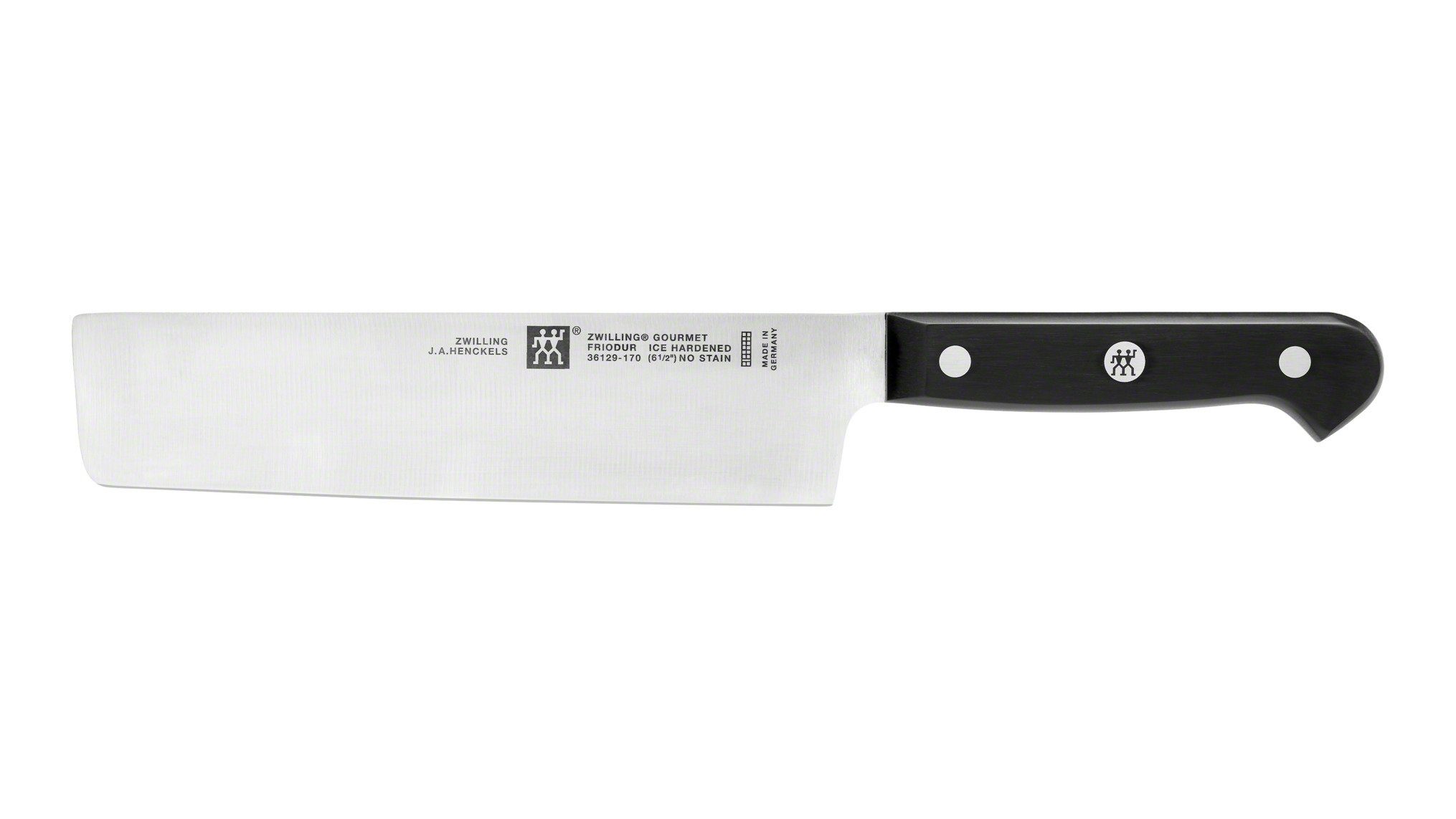 Zwilling NAKIRI ZWILLING Gourmet 170 mm 6 1/2 " Hergestellt in Deutschland Klingenlänge: 170 mm Mit der breiten Klinge des Nakiri-Messers aus der Serie ZWILLING Gourmet können Sie im Handumdrehen jegliches Gemüse zerteilen und klein schneiden. Die eisgehärtete FRIODUR Klinge erlaubt exakte Schnitte und der ergonomische Griff aus Kunststoff im Drei-Nieten-Design mit eingelasertem ZWILLING Logo auf der mittleren Niete sorgt für ein ermüdungsfreies und sicheres Arbeiten. Das Messer mit einer 17 cm langen Klinge ist einfach zu handhaben und auch für Einsteiger geeignet. In Japan ist das Nakiri-Messer in nahezu jeder Küche zu finden, denn dort sind verschiedene Gemüsesorten eine Hauptzutat in traditionellen Gerichten. Wenn auch Sie häufig Gemüse verarbeiten möchten, dann ist das qualitativ hochwertige Nakiri-Messer genau die richtige Wahl. Japanisches Gemüsemesser Zum Schneiden von Gemüse, Kräutern und Salaten Für Hobbyköche und Profis