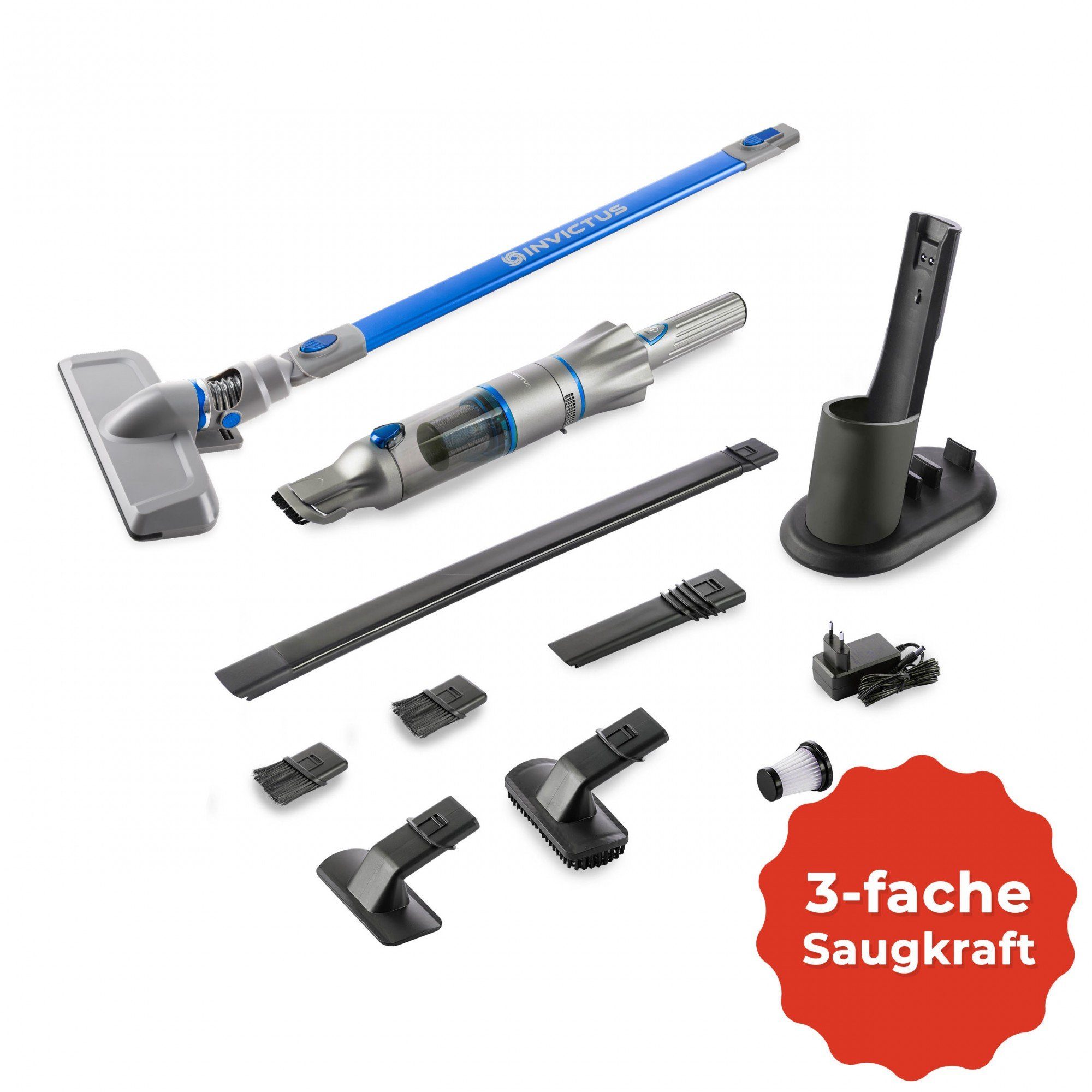 Lieferumfang | Dieses Set beinhaltet: INVICTUS ONE 2.0 Set 9-tlg. 1 x Hauptgerät 1 x Staub-Behälter 1 x Bürstenaufsatz 2 x HEPA-Filter 1 x Edelstahl 18/10 Filter 1 x Ladestation 1 x Fugendüse 1 x Ladekabel INVICTUS ONE 2.0 Zubehör-Set 3-tlg. 1 x Flexible Fugendüse 1 x Textilbürste 1 x Softbürste Invictus One 2.0 Boden-Set 3-tlg. 1 x Bodendüse 1 x Saugrohr (ca. 65 cm) 1 x Minibürste |
