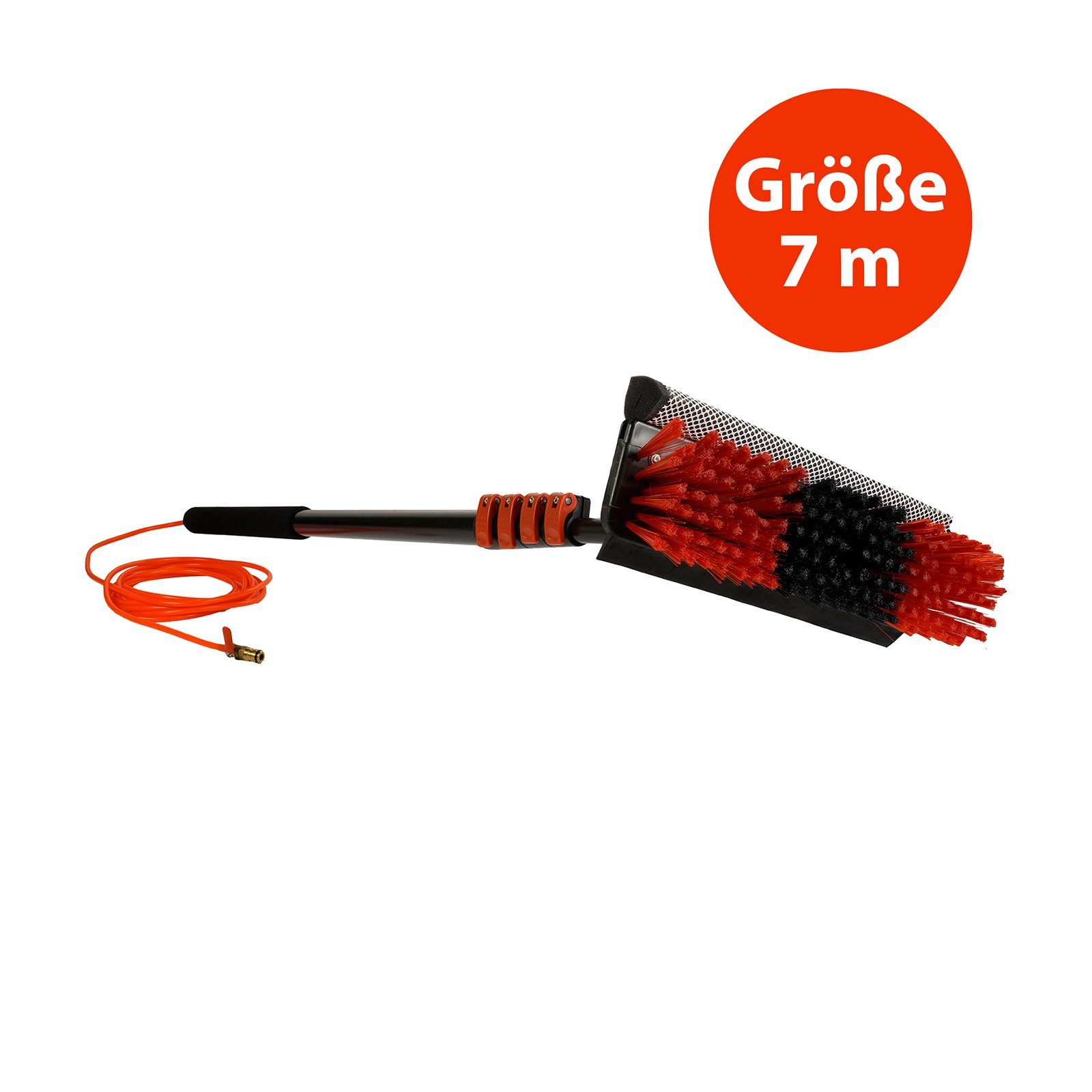 Hinweis Lieferumfang | 1 x Reinigungsbürste inkl. Schwamm und Wischer 1 x Seifenspender mit Kupplung 1 x Wasserrohr mit Kugelventil 1 x Winkeladapter 1 x T-Stück mit Rohr 1 x Teleskopstange (7 Meter) |