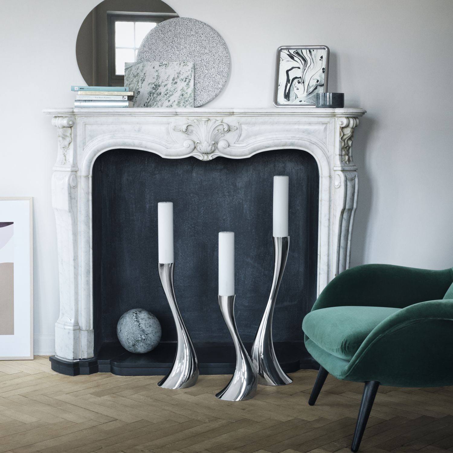 Die auffälligen organischen Formen der Kerzenhalter verleihen jeder Tischdekoration einen dynamischen Touch. Der Eindruck von Bewegung und die Verbindung von Design und Funktion sind nach wie vor präsent. Der elegante, silberne Schimmer macht diese Stücke zu einer augenfälligen Ergänzung für jede Dekoration. Bitte beachten Sie, dass die Kerzen (3586472) separat erhältlich sind. Der kleine Bodenkerzenleuchter ist 40 cm hoch.