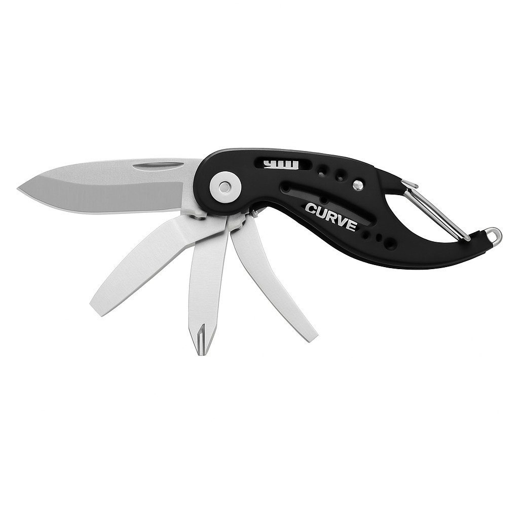 Das universell einsetzbare Multi-Tool eignet sich für verschiedene Arbeiten und ist somit der ideale Begleiter für zu Hause, beim Camping oder sonstigen Ausflügen. Zu den Funktionen gehören Messer, Schlitzschraubendreher, Kreuzschlitzschraubendreher, Ahle, Feile und Flaschenöffner. Zudem zeichnet es sich durch eine robuste Edelstahl-Konstruktion mit Aluminiumgriffschalen und einer Verriegelungsfunktion für sicheres Arbeiten aus. Dabei bleibt es leicht, handlich und überall verstaubar. Zur griffbereiten Aufbewahrung oder zur Befestigung am Schlüsselbund ist das Tool mit einem Karabiner ausgestattet