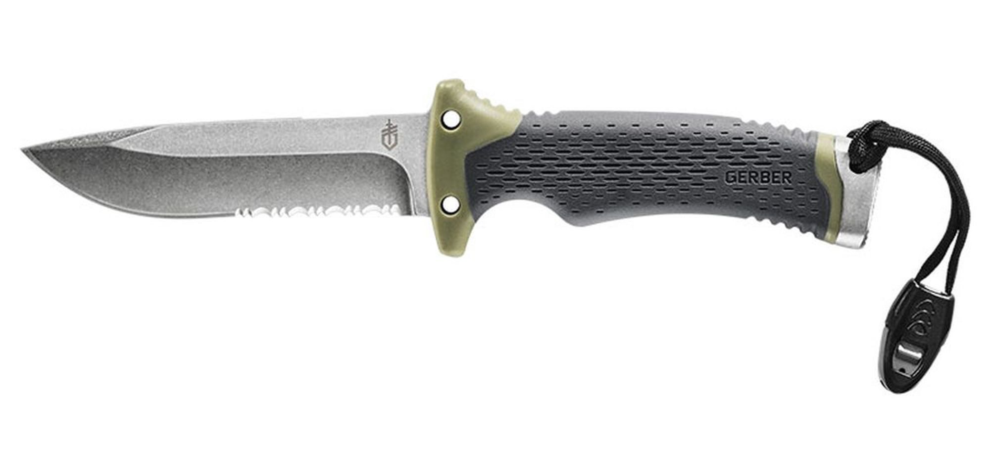 Das Gerber Ultimate Survival Messer tritt die Nachfolge des legendären BG Ultimate Survival an. Die glatte Klinge besteht aus rostfreiem 7Cr17MoV Stahl mit einem glasperlengestrahlten Finish. Der mit rutschfestem Polypropylen bestückte Griff wird durch eine Hammerfläche aus rostfreiem Stahl abgeschlossen. Mehrere Griffbohrungen ermöglichen die vielseitige Befestigung und Sicherung des Messers. Sehr nützliches Zubehör wird in Form eines Feuerstarters, eines Schärfsteins und einer Signalpfeife mitgeliefert. Für die Unterbringung von Messer und Zubehör wird eine variabel zu tragende Scheide aus einer Nylon-/Kunststoffkombination mitgeliefert.