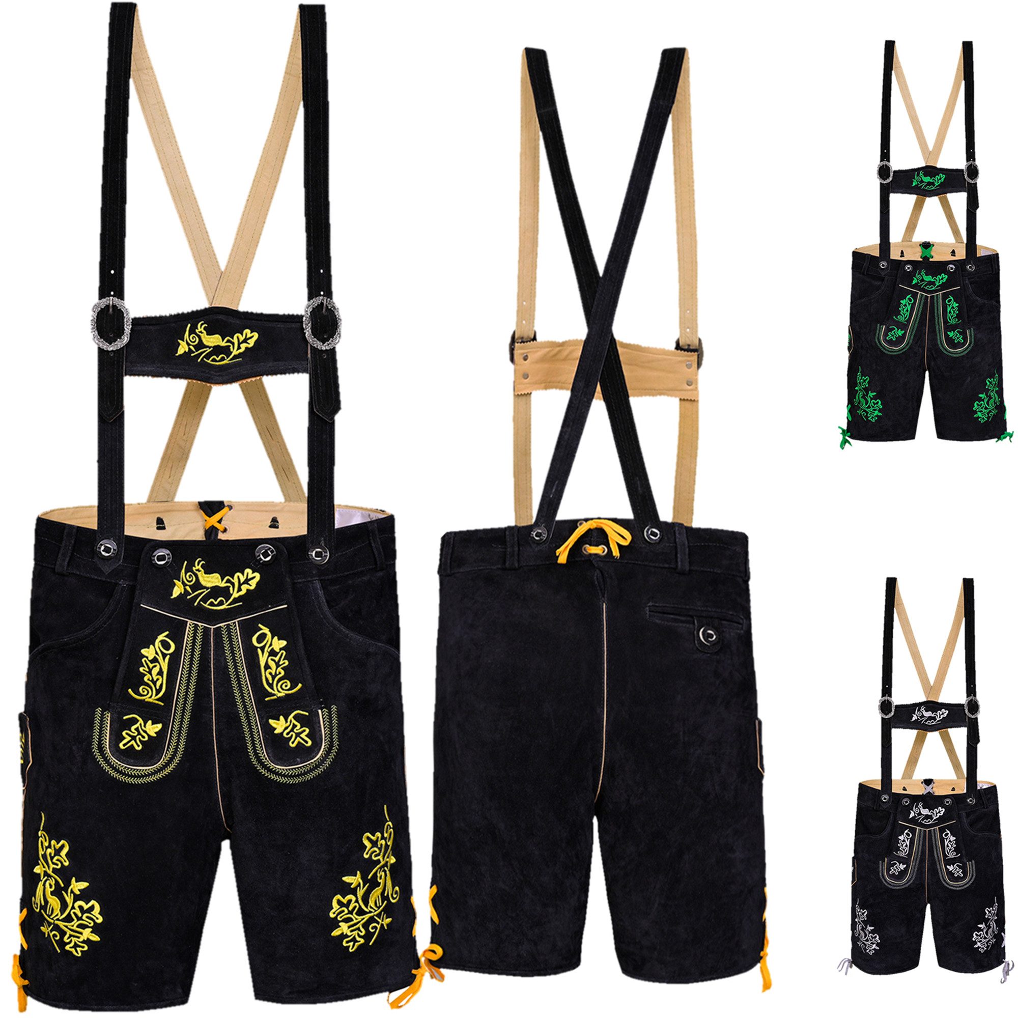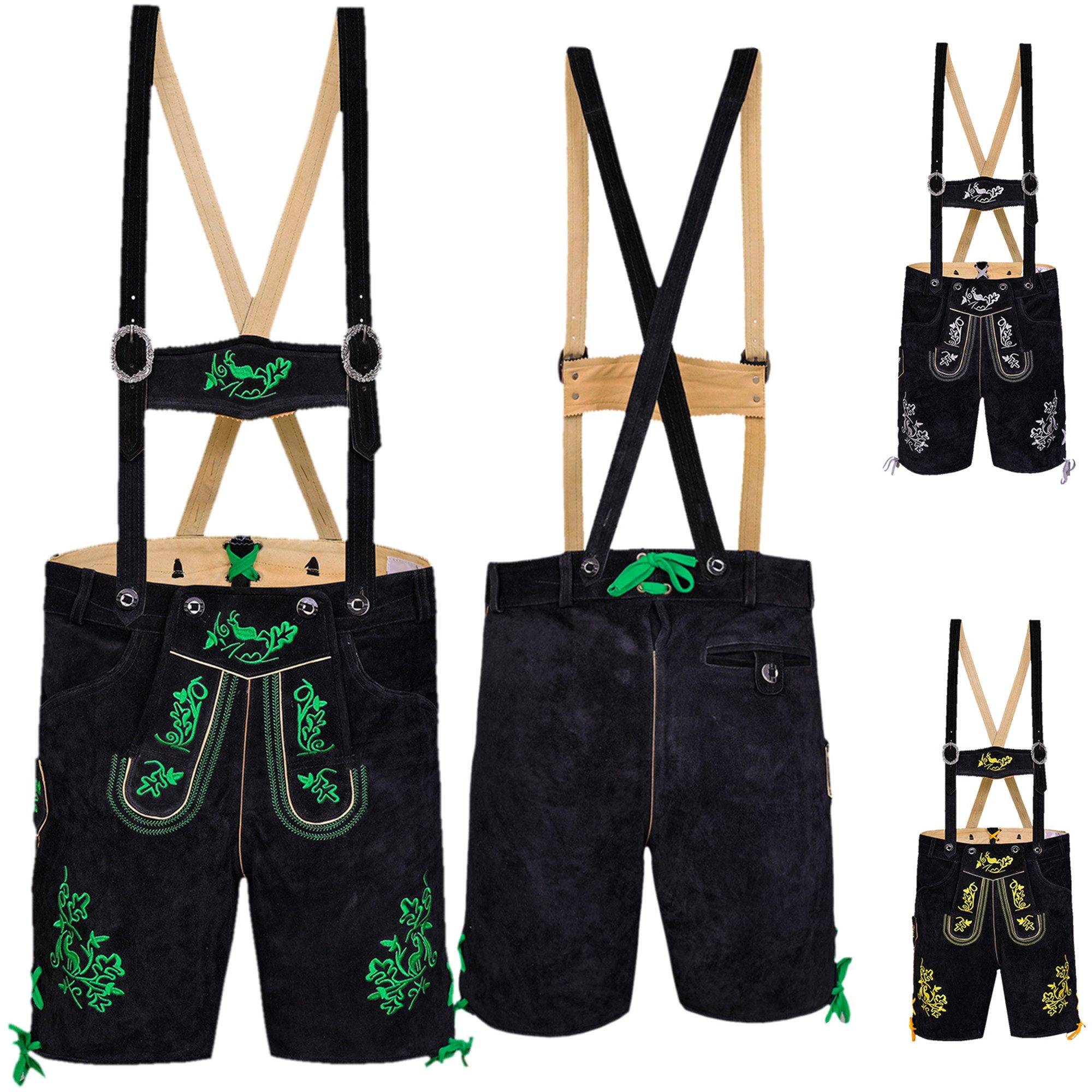 Kurze Lederhose aus echtem weichem Wildleder mit Hosenträgern in der Farbe Schwarz mit Stickerei