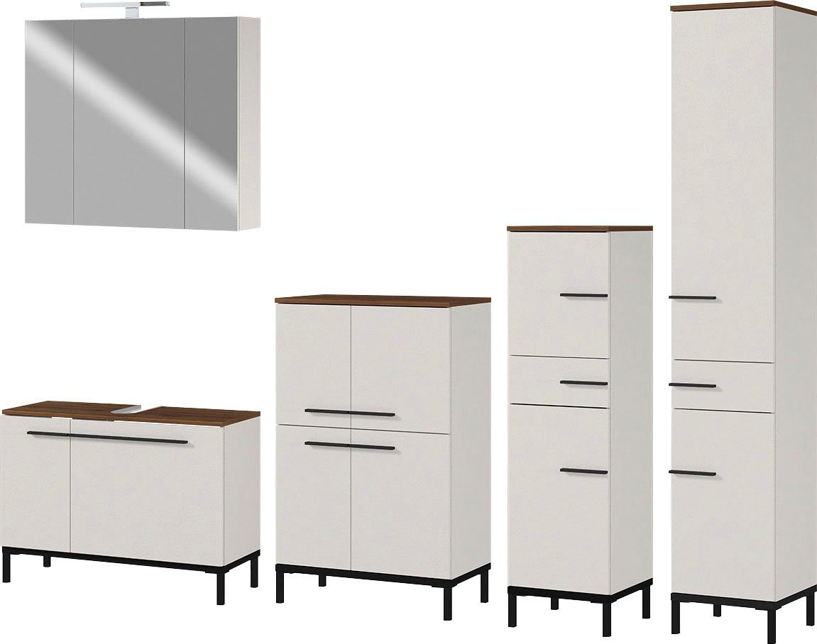 Set beinhaltet | Set bestehend aus 1 Waschbeckenunterschrank, 1 Spiegelschrank, 1 Kommode, 1 Mediumschrank und 1 Hochschrank |