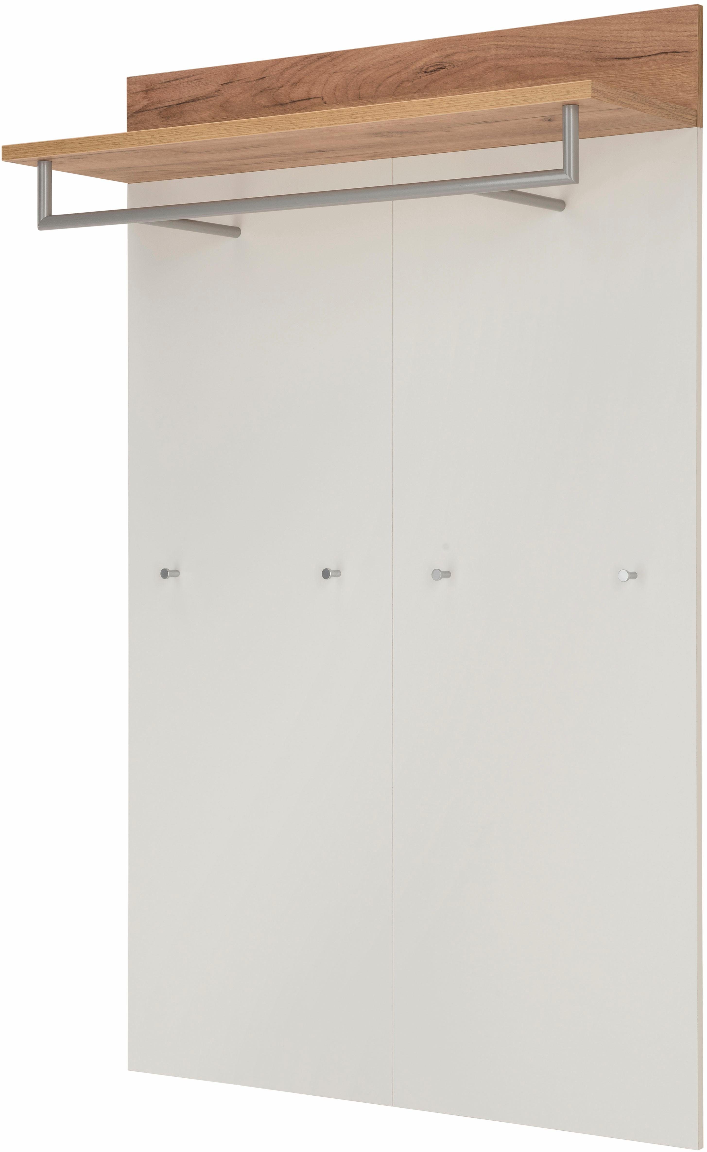 Wissenswertes | Garderobenpaneel mit 1 Ablageboden, 1 Kleiderstange und 4 Kleiderhaken; Ablageboden bis ca. 10 kg belastbar, Kleiderstange ebenfalls bis ca. 10 kg und Kleiderhaken je bis zu 3 kg belastbar; Korpus aus Spanplatte mit Melaminharz-Beschichtung; inkl. Wandaufhängung* * Lediglich Schrauben und Dübel müssen entsprechend der Wandbeschaffenheit separat erworben und verwendet werden. In folgenden Farben erhältlich: