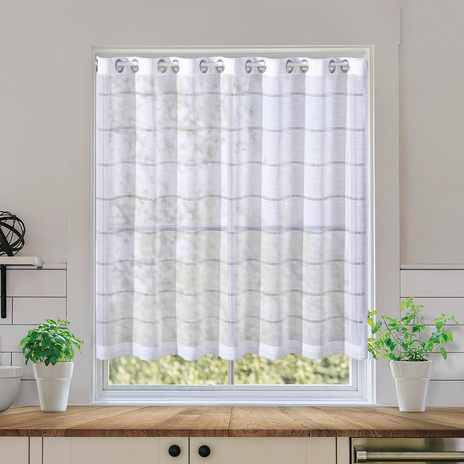 Die Scheibengardine OLGA wirkt am Fenster zeitlos und elegant. Die Kurzgardine hat waagerechte Streifen eingewoben. Die 14 eingestanzten kleine Ösen haben einen Innendurchmesser von ca. 2 cm, mit welchen die Scheibengardine schnell und einfach auf eine Klemmstange oder Vitragenstange aufgezogen werden kann.