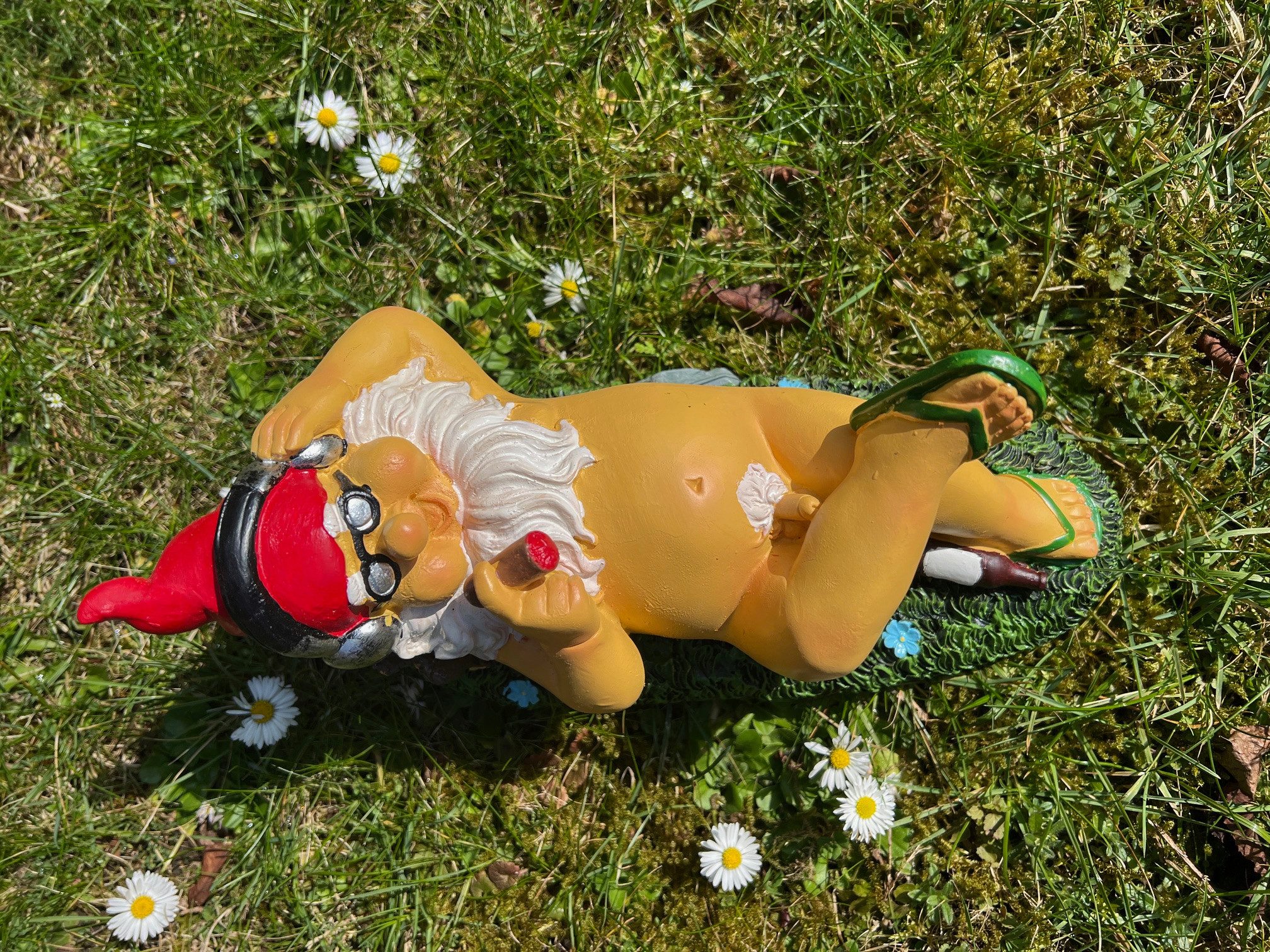 Dieser Gartenzwerg hat das Leben verstanden! Liegend im Gras, die blauen Flip-Flops lässig abgestreift, genießt er seinen Feierabend mit Kopfhörern auf den Ohren und einem entspannten Zigarello in der Hand. Wer sagt, dass Zwerge immer fleißig sein müssen? „Chillbert“ zeigt, wie’s richtig geht – in voller Zwergenpracht, ganz ohne störende Kleidung!