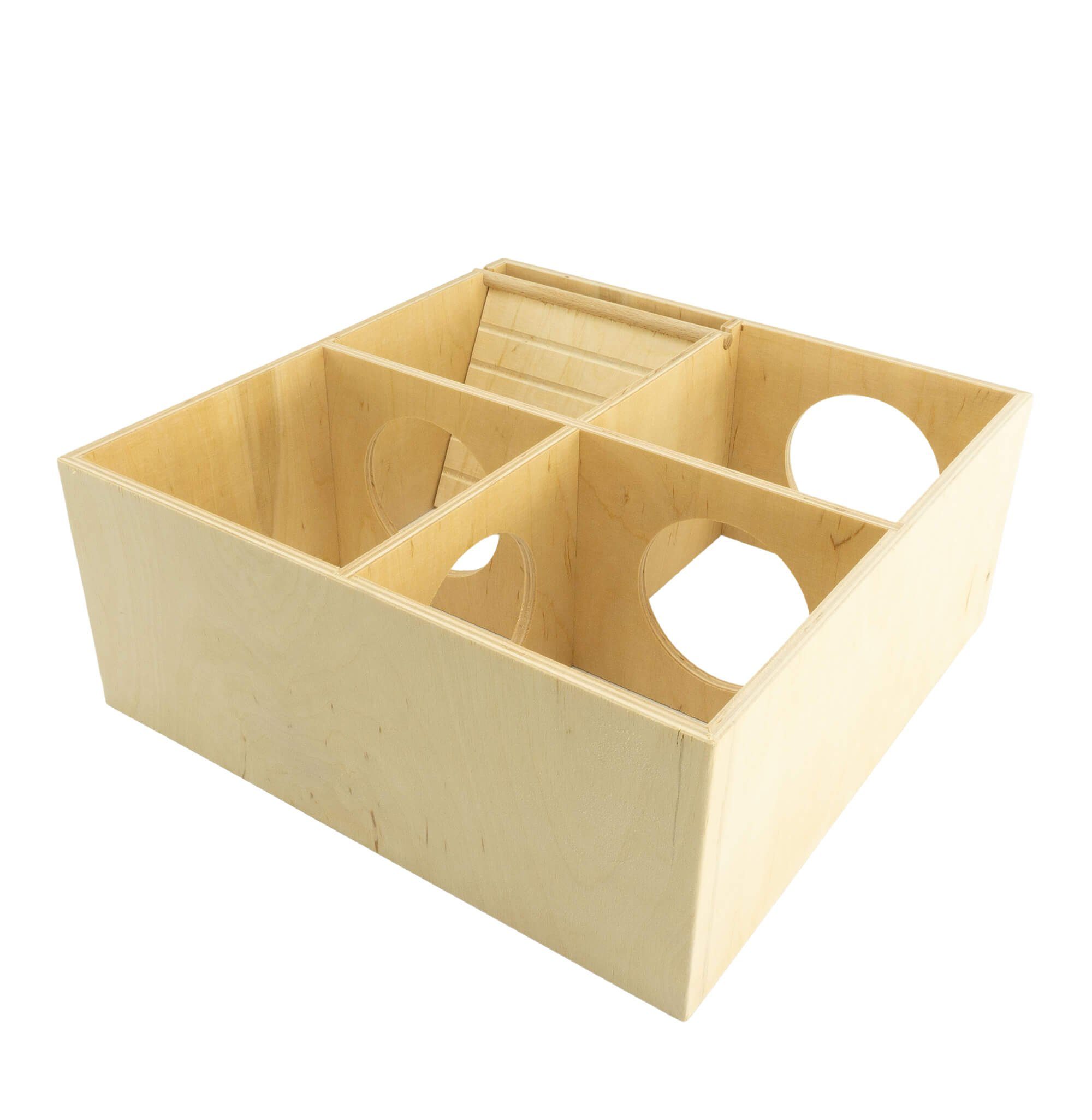 Entdecken Sie das neue und geräumige Wohnhaus Odin, das speziell für die artgerechte Haltung von Goldhamstern, Degus oder Mäusen konzipiert wurde. Mit einer Grundfläche von 29x29 cm und einer Höhe von 13 cm bietet es genügend Platz für Ihren liebsten Nager, um sich frei zu bewegen und sich wie in einem natürlichen Hamsterbau zu fühlen. Das Vierkammernsystem des Wohnhauses gibt Ihrem Nager die Möglichkeit, sich seinen Schlafplatz oder seine Vorratskammer auszusuchen und ein abnehmbares Dach ermöglicht Ihnen eine störungsfreie Nestkontrolle.