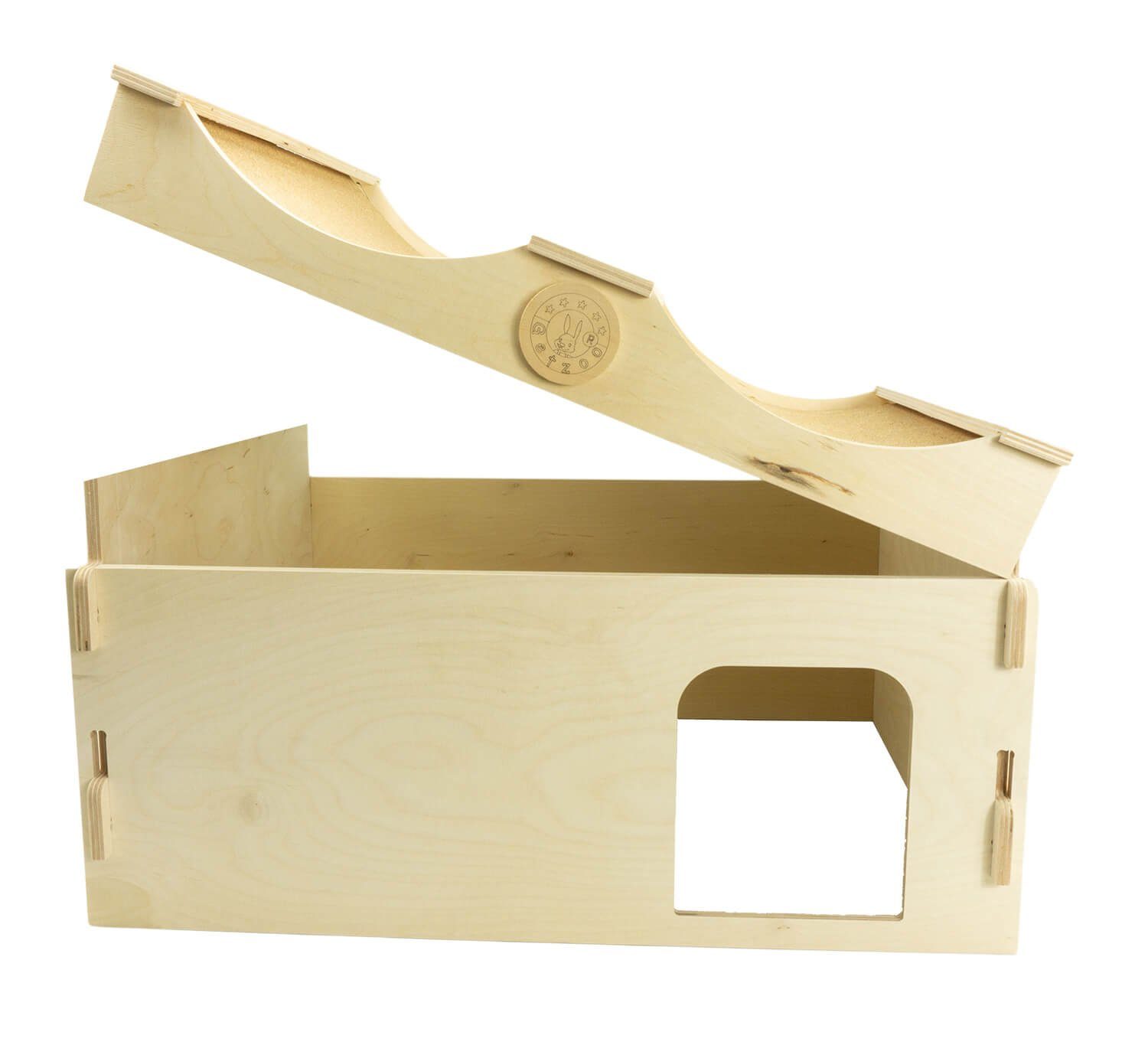 Ein besonderes Highlight dieses Hauses ist das innovative, abnehmbare Dach, ausgestattet mit zwei austauschbaren Korkliegeflächen. Diese bieten nicht nur eine natürliche und warme Oberfläche, auf der sich Ihre Kaninchen ausruhen können, sondern ermöglichen auch eine einfache Reinigung und Wartung. Der Korkbelag ist waschbar, was zur Hygiene und zum Komfort des Hauses beiträgt.