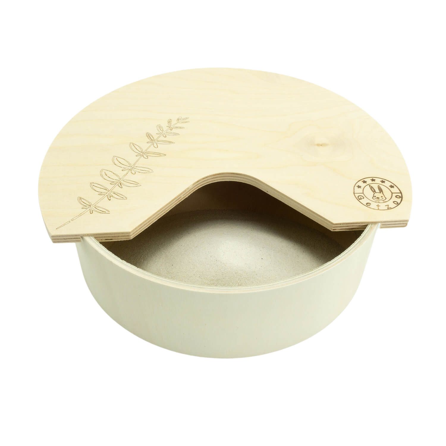 Der abgerundete Deckel des Sandbades ragt etwa 2 cm über den Rand hinaus, was zusätzlichen Schutz vor Herausfallen des Sands bietet und das Eindringen von Schmutz vermindert. Inklusive des Deckels misst das Sandbad 29 cm im Durchmesser, was ausreichend Raum für ausgiebiges Scharren und Baden bietet, ohne zu viel Platz zu beanspruchen. Die Höhe des Sandbades beträgt 9 cm, was es kompakt genug macht, um es leicht in Käfigen oder Spielbereichen zu platzieren, ohne dass es zu aufdringlich wirkt. Dieses stilvolle und funktionale Sandbad ist ideal für Tierhalter, die Wert auf die Gesundheit und Hygiene ihrer kleinen Lieblinge legen.