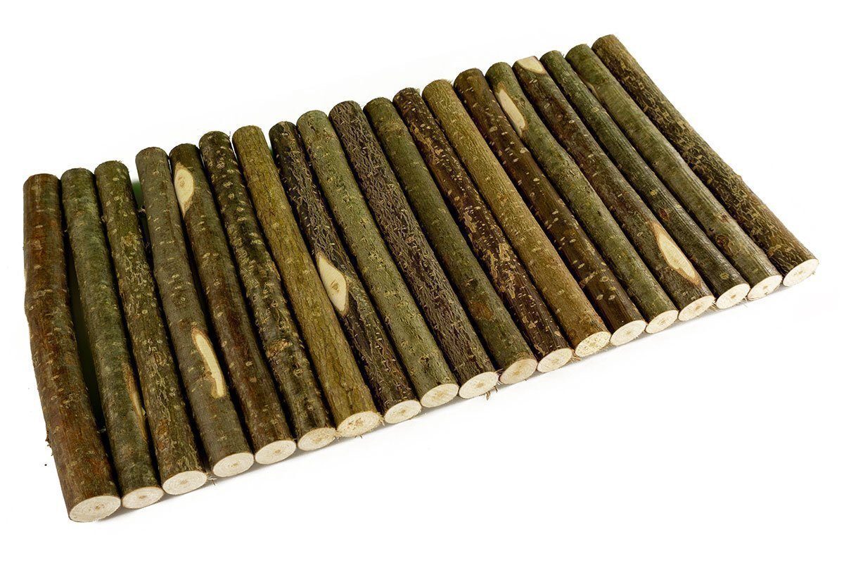 Die Zweige werden dicht an dicht auf zwei dicke Drähte gezogen, sodass Spalten zwischen den einzelnen Ästchen minimal gehalten werden und kein Pfötchen hängen bleiben kann. Der Dicke Draht sorgt dabei für die nötige Stabilität, ist dabei aber tief genug im Holz, um nicht ihrem liebsten Nager zu schaden. Dennoch lässt sich die Haselnussbrücke kinderleicht in fast jede Form bringen.