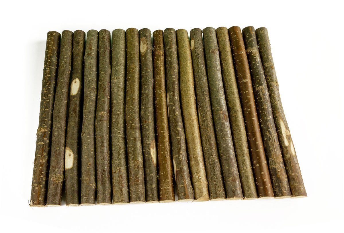 Die Zweige werden dicht an dicht auf zwei dicke Drähte gezogen, sodass Spalten zwischen den einzelnen Ästchen minimal gehalten werden und kein Pfötchen hängen bleiben kann. Der Dicke Draht sorgt dabei für die nötige Stabilität, ist dabei aber tief genug im Holz, um nicht ihrem liebsten Nager zu schaden. Dennoch lässt sich die Haselnussbrücke kinderleicht in fast jede Form bringen.