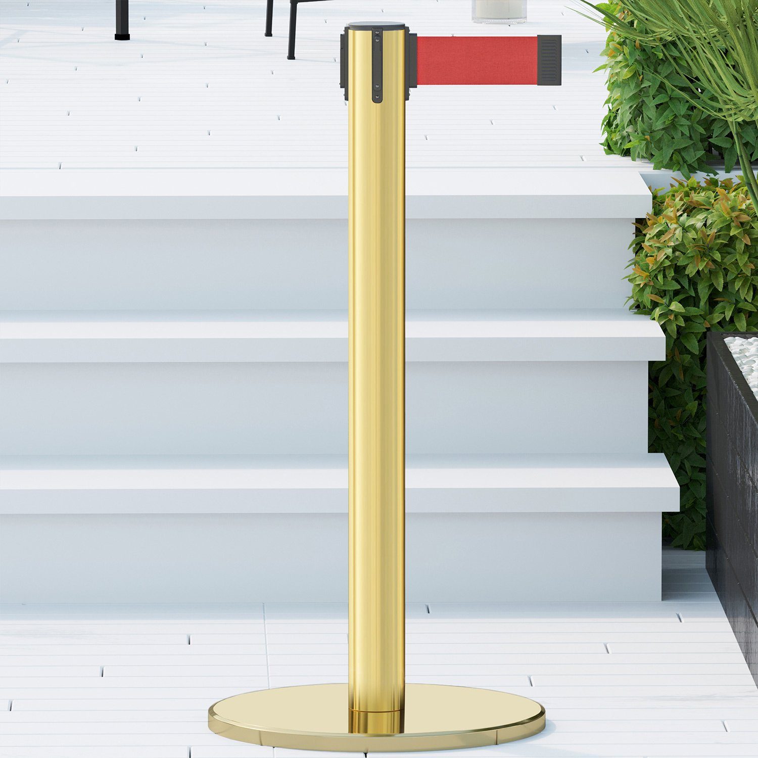 patentierten Gurtband-Systems , das den Rücklauf der Gurte verlangsamt, die Verletzungsgefahr reduziert und somit Ihre Besucher schützt, gelten die flexiblen Gurtständer mit Zugband zu den sichersten auf dem