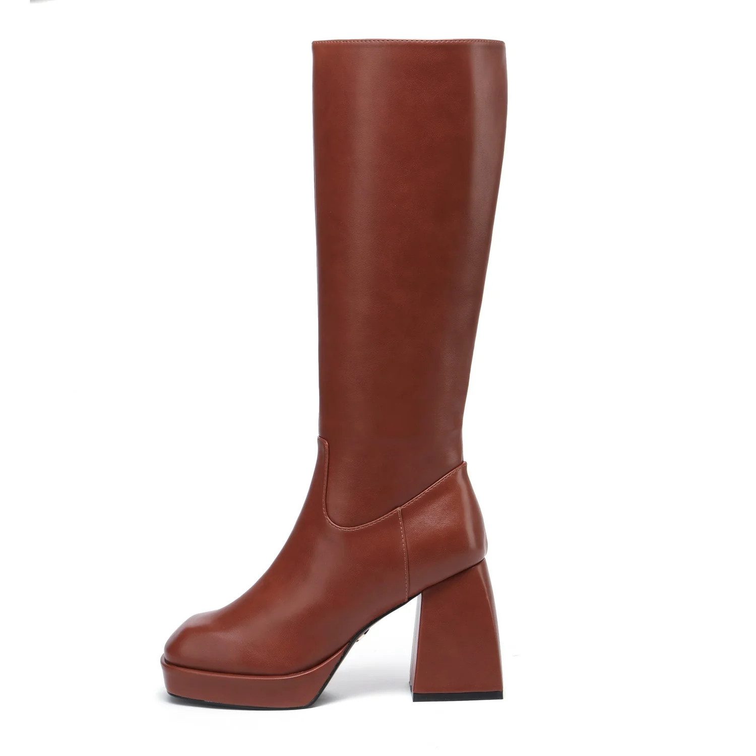Design & Farben: Kniehoher Schaft mit eckigen Details und Blockabsatz; erhältlich in Brown Matt, Black Matt und Black Shiny