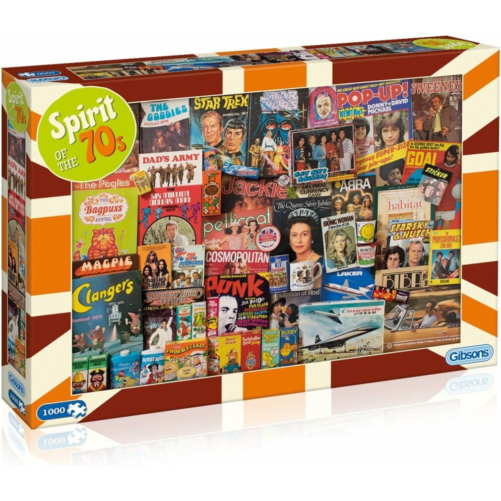 Im Jahr 1971 stand Großbritannien vor einem mathematischen Problem, als die Umstellung auf das Dezimalsystem die alten Schillings und Pence verdrängt hat. Um diese kontinentale Verschiebung zu verstärken, trat das das Land der europäischen Gemeinschaft (bestätigt durch das Ja im Referendum 1975) bei. Nach vielen wirtschaftlichen Sorgen, der 3-Tage-Woche und der 25-Prozent-Inflation kam das Land zusammen, um im Jahr 1977 das Silberjubiläum der Queen zu feiern. Prunk und Straßenfeste haben den Geist des Ereignisses eingefangen. Als die Pop-Musikszene reifte, erweiterte sich ihr Publikum auf eine jüngere Altersgruppe - die Teeny Boppers. Wer könnte sich zwischen den Mädchenschwärmen der Osmonds, David Cassidy und Michael Jackson, entscheiden? Im Jahr 1974 erreichte die Rollermania ihren Höhepunkt mit dem Einzug der Bay City Rollers. Im gleichen Jahr gewann Abba den Eurovision Song Contest mit "Waterloo". Glam Rock wetteiferte mit Heavy Metal-Klängen, während die alternative Stimme aus dem Anarcho-Punk von LED von den Sex Pistols kam. Später in den 70er Jahren pulsierten durch die Discomania überall Tanzflächen, eine Energie, die durch den Erfolg von Saturday Night Fever geschaffen wurde. Als Großbritannien in den frühen 70er Jahren auf Plateau-Schuhen wankte, versuchten Viele trotz der immer weiter wachsenden Auswahl an Snacks, ihre Balance durch das Zählen von Kalorien zu halten mit zählen. Die Ära der Weltreisen begann als ein Boeing 747 Jumbo Jet in Heathrow landete. Economy-Tarife wurden durch den Luftzug von Freddy Laker angeboten, die Concorde sorgte ab 1976 für eine sehr schnelle, aber teure, Alternative zu Amerika. Während das Fernsehen von Bagpuss bis zu den Streichen von Emu (der Michael Parkinson im Jahr 1976 attackierte) mit Unterhaltung gefüllt war, war es der Film "Star Wars", der die Phantasie einfing. Wie alle Puzzles von Gibsons ist auch dieses wunderschön illustriert, besteht aus hochwertigem 100 % recyceltem Karton und wird daher mit Freude wieder und wieder verwendet.