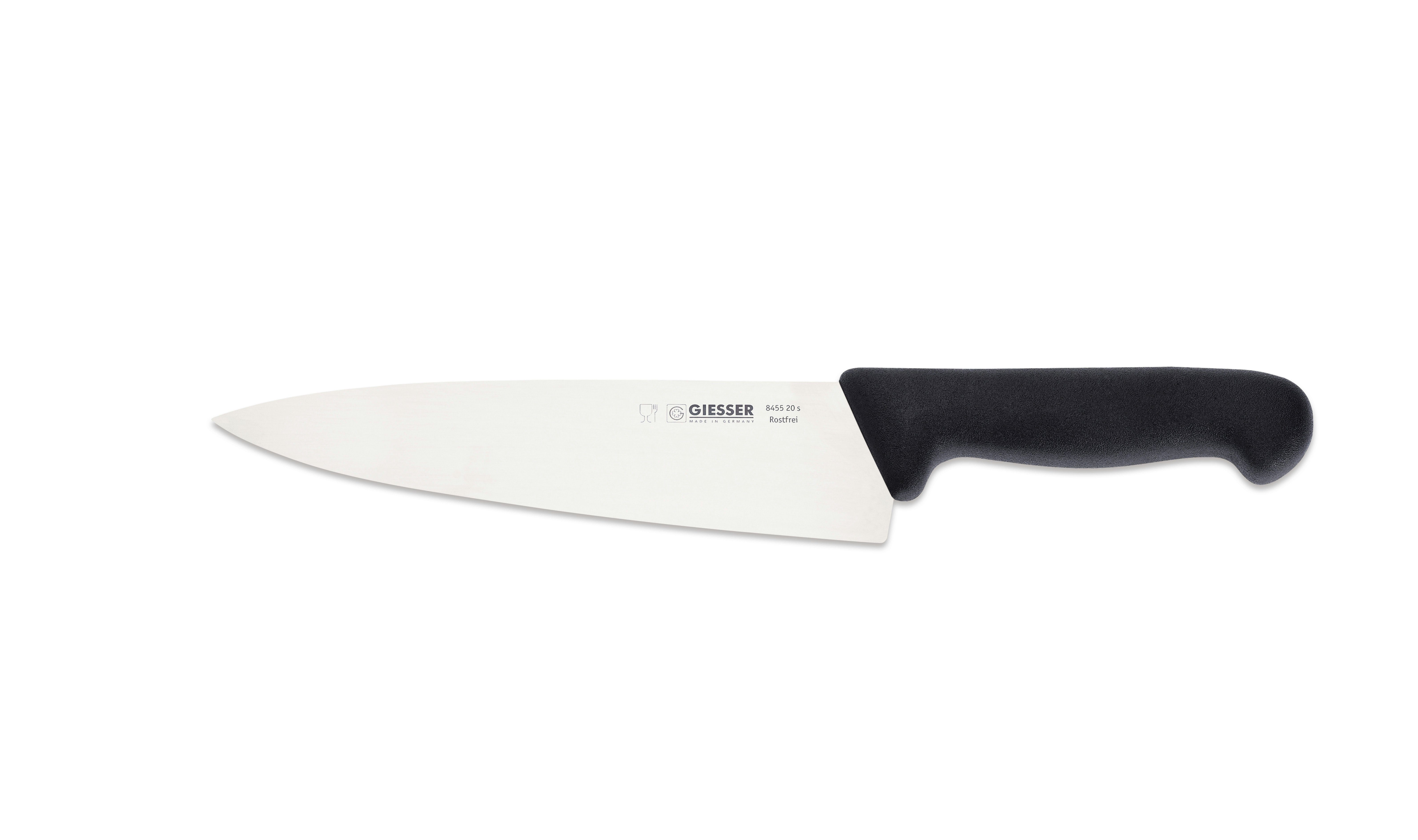 Das Giesser Kochmesser 8455 ist ein hochwertiges Messer der renommierten deutschen Messerschmiede Johannes Giesser Messerfabrik GmbH. Es verfügt über eine scharfe Klinge aus Chrom-Molybdän-Spezialstahl, die durch einen speziellen Schliff besonders effizient schneidet. Mit einer Härte von 55 bis 56 HRC und einer Длина von 16 cm bis 31 cm ist das Messer ideal für viele Küchenarbeiten wie das Schneiden von Obst, Gemüse oder Fleisch. Die schmale, mittelspitze Klingenform und der abgerundete Messerrücken sorgen für maximale Kontrolle und Präzision beim Schneiden. Der ergonomisch geformte und rutschfeste Griff aus TPE-Kunststoff ist in den Farben schwarz, blau, braun, gelb, grün, limette, pink, rot, weiß und halal violett erhältlich und bietet eine hervorragende Balance zwischen Klinge und Griff für ermüdungsfreies Schneiden. Das Kochmesser ist ein hochwertiges Werkzeug für den täglichen Gebrauch in der Küche und hat eine lange Lebensdauer. Zudem ist es Made in Germany und spiegelt die hohe Qualität und jahrzehntelange Erfahrung der Johannes Giesser Messerfabrik GmbH wider.