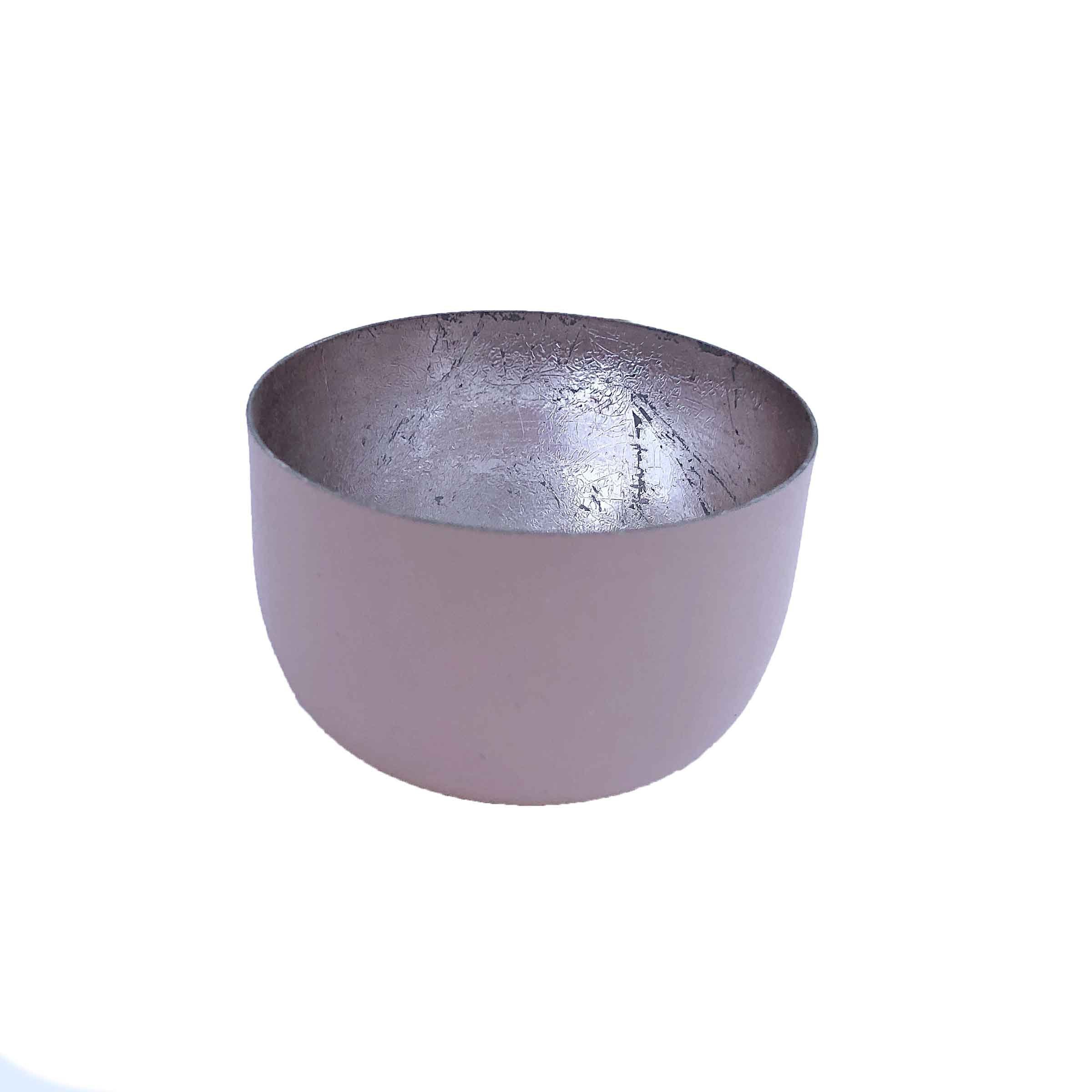 Der zarte Teelichthalter aus Metall, innen roségoldfarben, außen zartrosé handbemalt, ist mit seinen warmen Farben ein Eyecatcher auf jedem Tisch und ein beliebtes Mitbringsel zu jeder Gelegenheit.