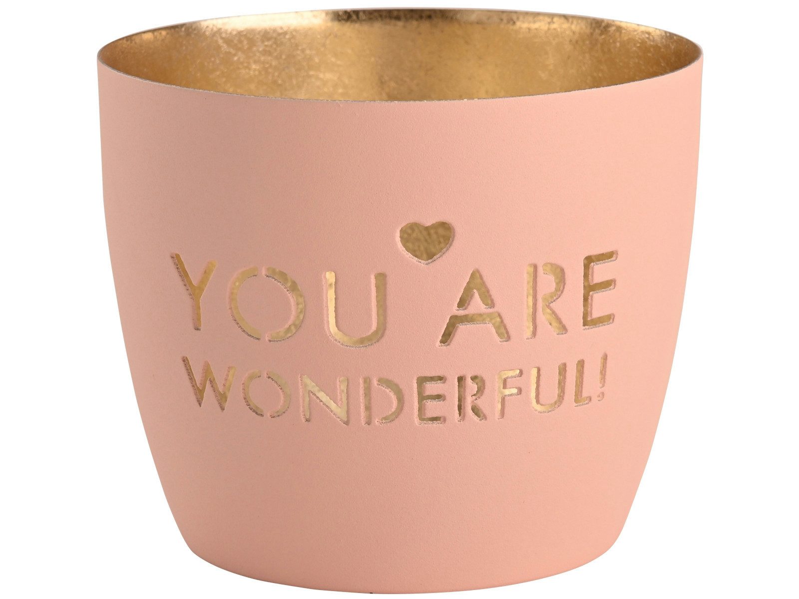 Sagen Sie es mit Herz: Das bezaubernde Windlicht „You are wonderful!“ von Giftcompany zaubert eine liebevolle Botschaft in jeden Raum. Außen strahlt das Windlicht in zartem Pastellrosa, während die goldfarbene Innenseite warmes und stimmungsvolles Licht reflektiert. Ein wunderschönes Accessoire, um Anerkennung, Wertschätzung und Zuneigung auszudrücken.