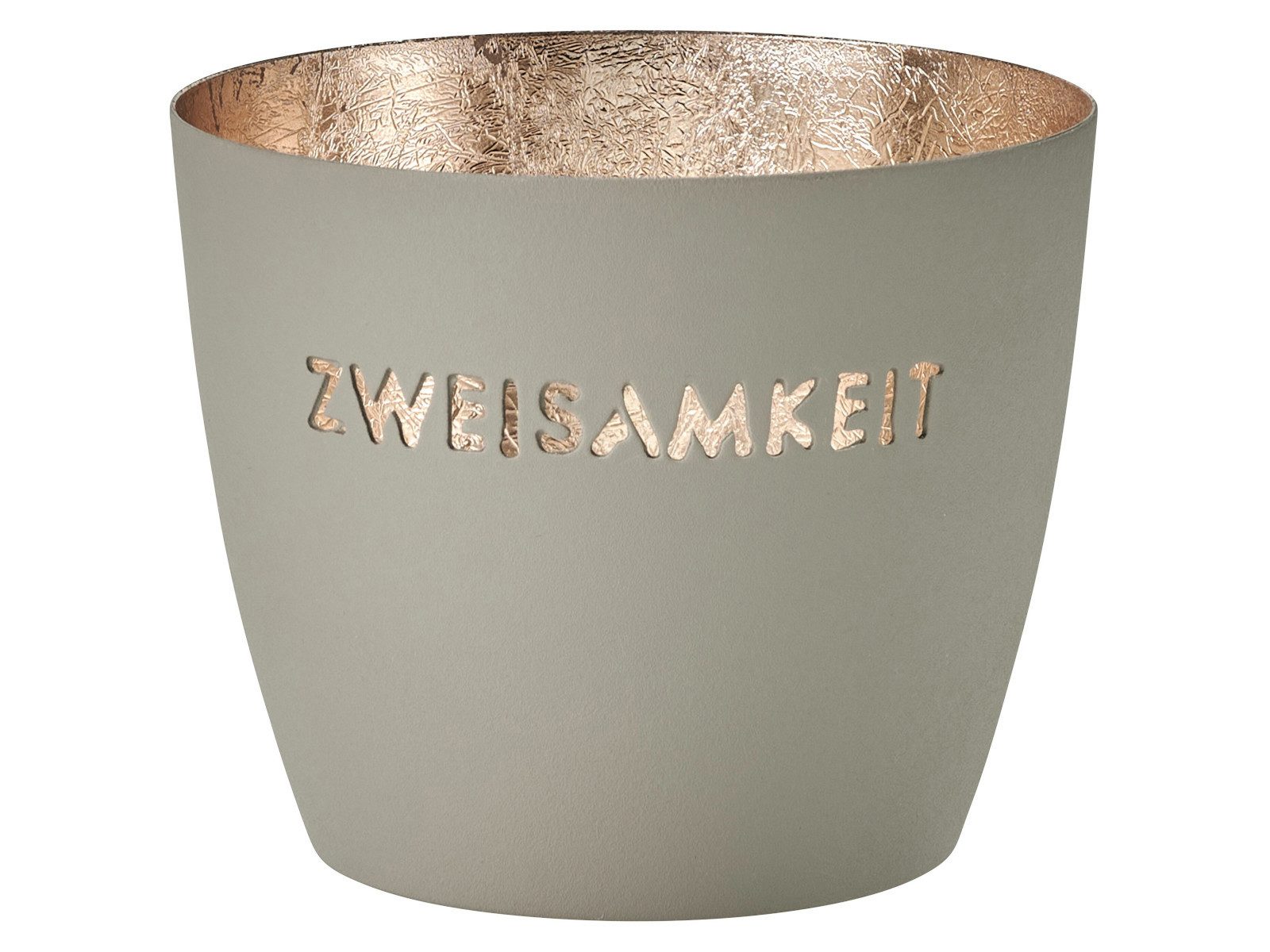Das stilvolle Madras Windlicht von Giftcompany verbreitet sanften Kerzenschein und warme Atmosphäre. Außen in elegantem Grau gehalten, verzaubert das Windlicht im Inneren mit edlem Goldglanz, der das Kerzenlicht besonders schön reflektiert. Der liebevoll gestaltete Schriftzug „Zweisamkeit“ macht es zum idealen Geschenk und stimmungsvollen Dekorationselement für gemütliche Abende zu zweit.