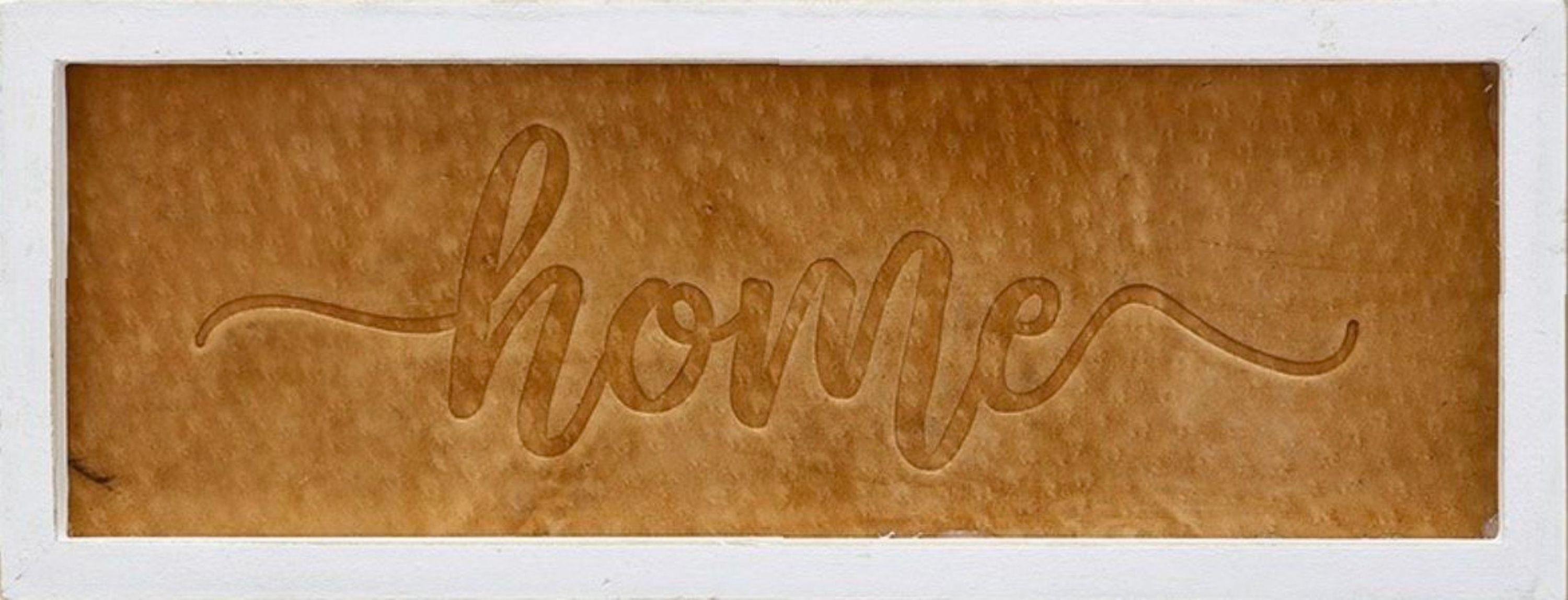 eingestanztem Motto: HOME. Außergewöhnliche Stand- oder Hänge Dekoration. Weißer Rahmen