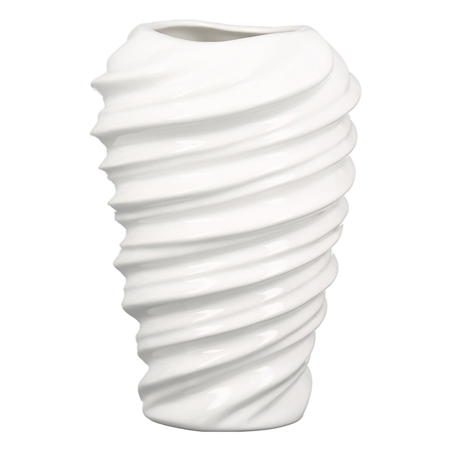 Die Vase Twist aus Keramik besticht durch ihre glänzende und strukturierte Oberfläche in elegantem Weiß.