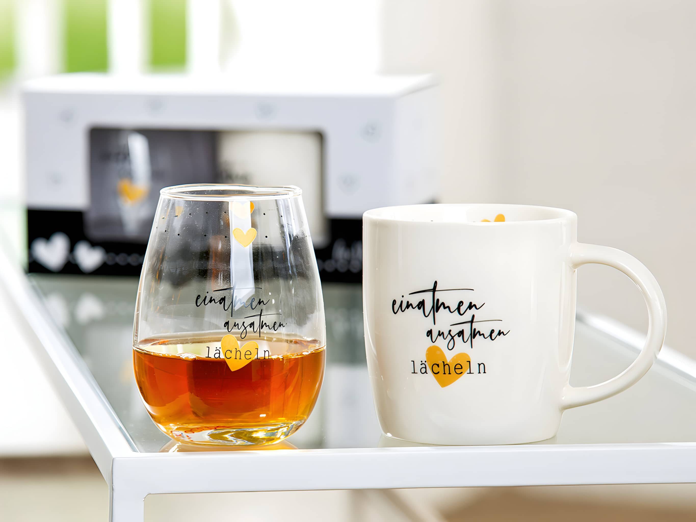 Geschenk-Set 2-tlg. "einatmen/ausatmen/lächeln" Tasse & Glas, in Geschenkbox