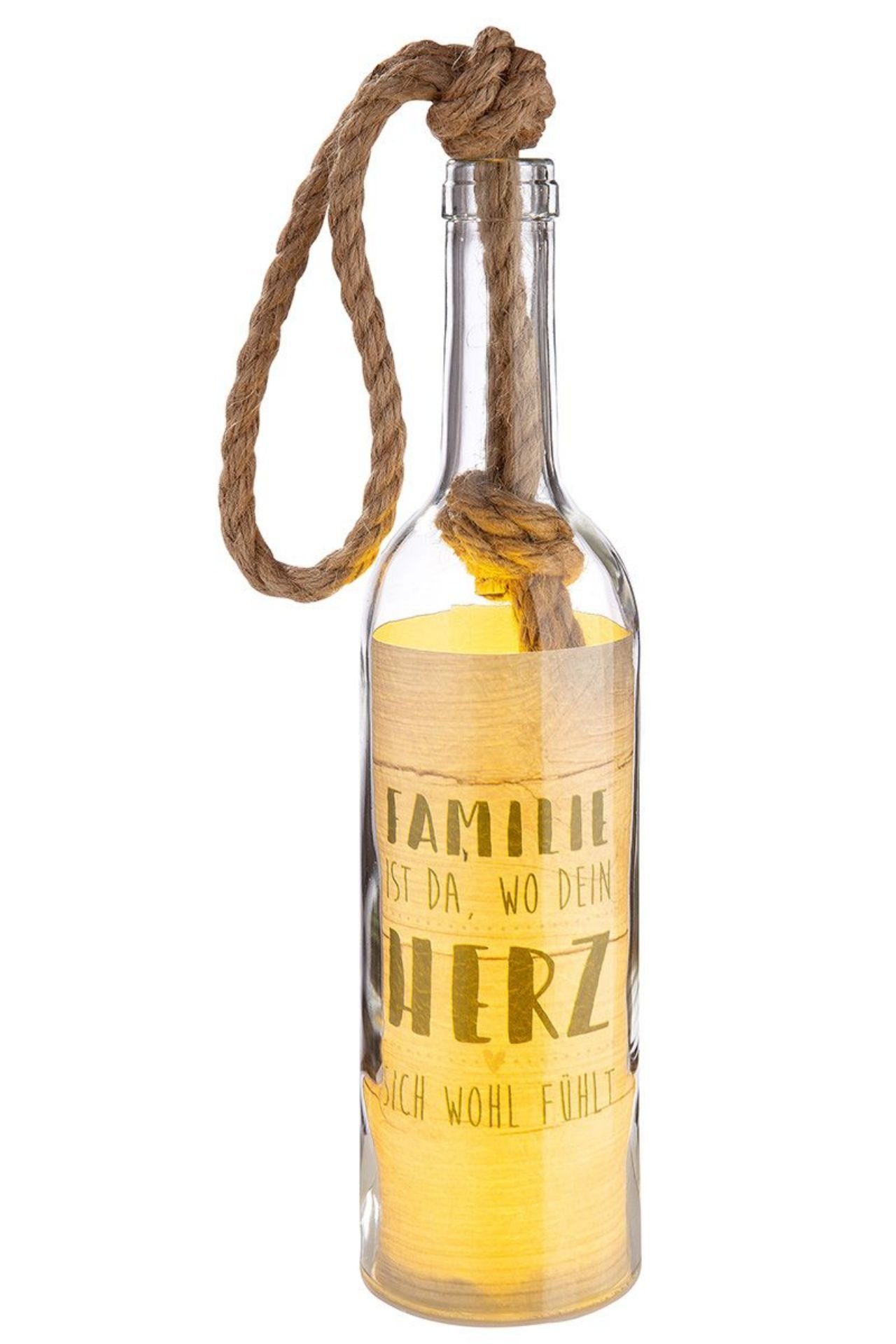 LED-Flaschenlicht mit integrierter Lichterkette top angesagt, im zeitlosen heimeligen Stil. LED Flasche mit Spruch, Modell: FAMILIE IST DA, WO DEIN HERZ SICH WOHL FÜHLT, bedruckt mit einem liebevollen Motto Vers. Hoher Neidfaktor.