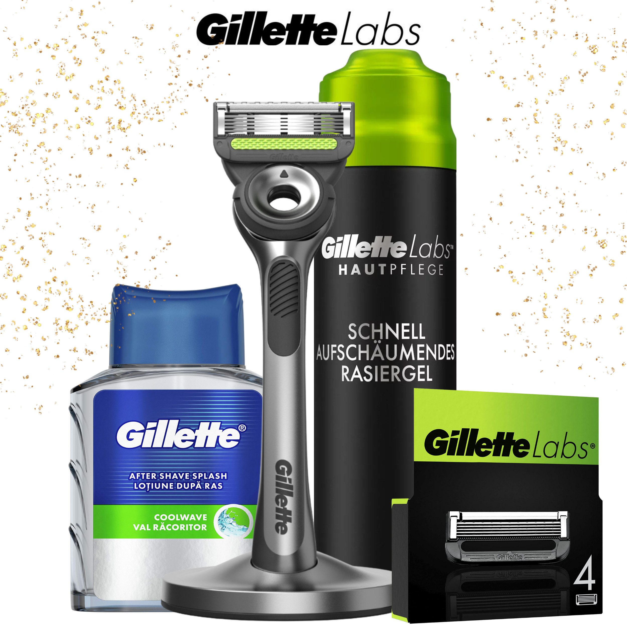 Lieferumfang | 1 x Labs Rasierer mit exfoliating bar + Klinge + Magnethalterung, 1 x 4er Labs Ersatzklingen, 1 x Labs SkinCare Rasierschaum 240ml , 1 x Gillette After Shave Splash Coolwave 100ml |
