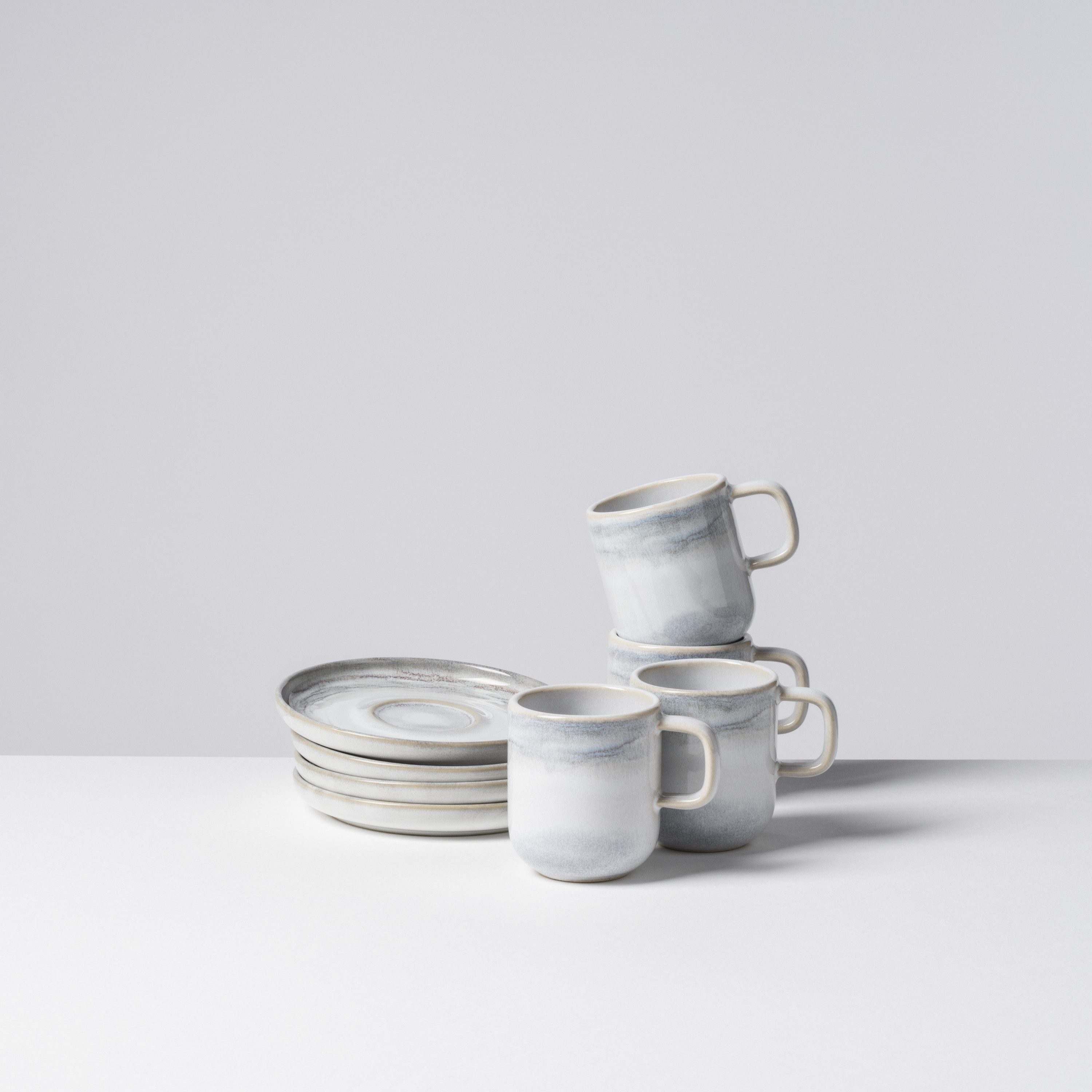 Das 8-teilige Set besteht aus 4 Espressotassen mit Henkeln und 4 passenden Untertassen