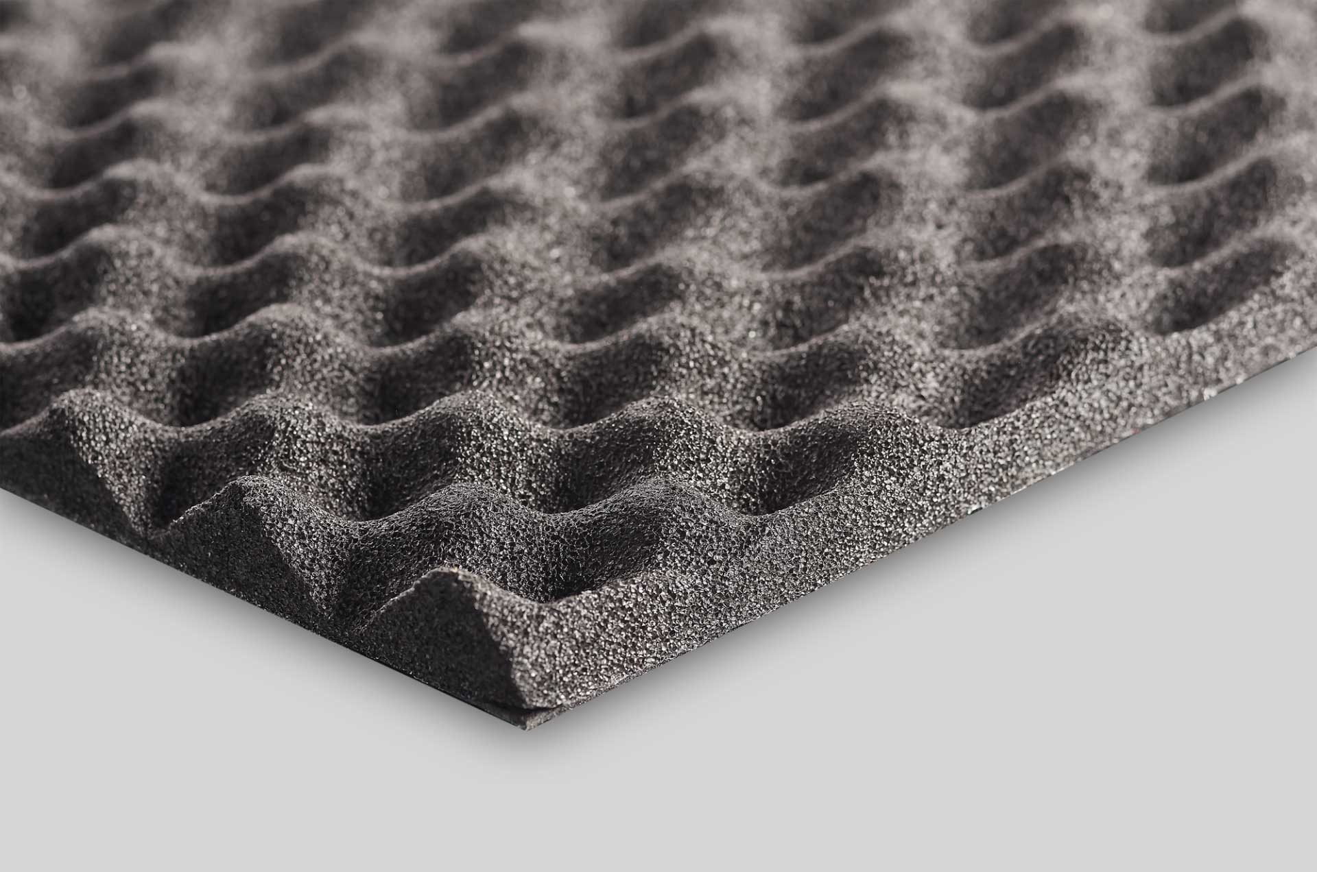 Selbstklebender, extrem anpassungsfähiger, wasserabweisender Gummischaumstoff. Durch die besondere Formgebung der Noppen eignet sich dieser ideal zum Bedämpfen von Lautsprechern in der Tür oder in Gehäusen, sowie zum Entkoppeln zweier Flächen (gleichermaßen bei ebenen und unebenen Flächen).