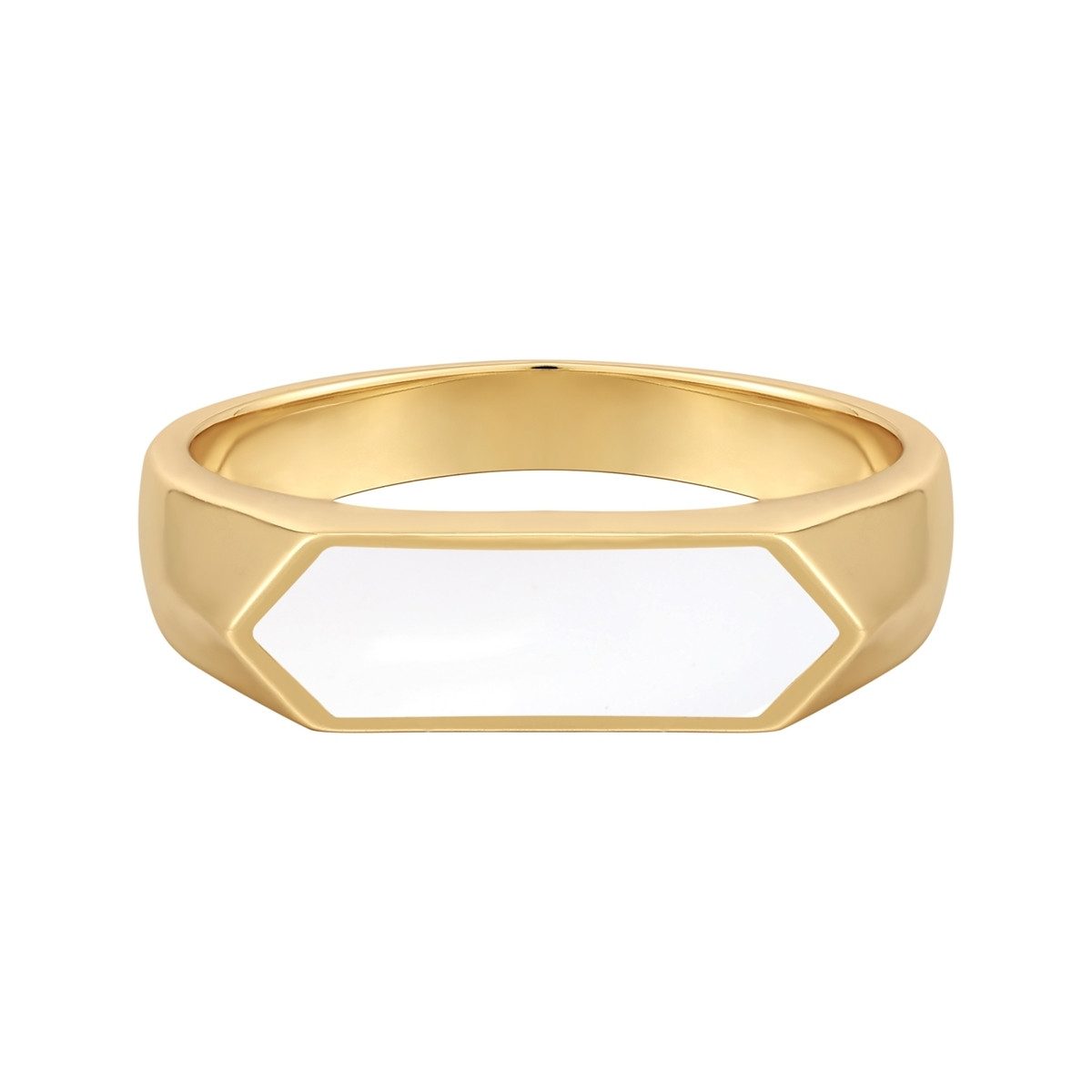 STILVOLLER MATERIALMIX: Ring aus gelbvergoldetem 925er Sterling Silber (14 Karat) mit weißem Emaille im modernen Geo-Design