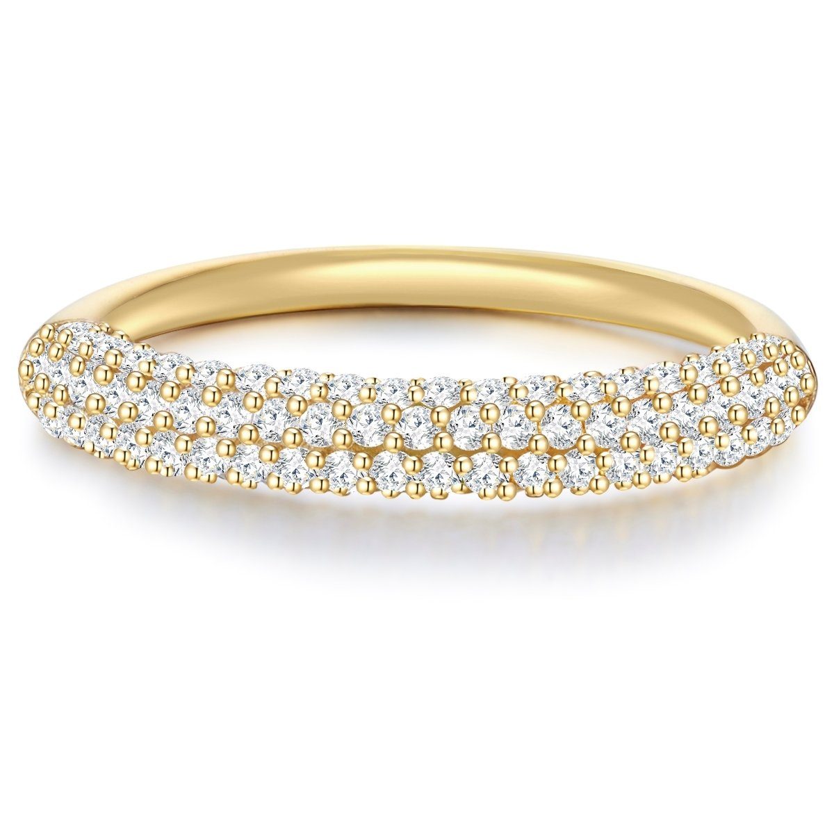 Wenn du Schmuck am liebsten glamourös magst, macht dich dieser Ring des Labels Glanzstücke München auf jeden Fall glücklich! Der Handschmeichler fasziniert mit einer Ringschiene aus 925er Sterlingsilber, halb ausbesetzt mit funkelnden Zirkoniakristallen in Pavéfassungen aus kleinen perlähnlichen Krappen. Eine Gelbvergoldung sorgt für den typisch warmen Schimmer der beliebten Goldnuance. Tipp: Der Ring kommt solo getragen am besten zur Geltung, kann aber auch als Eyecatcher im Stacking mit schlichten, schmalen Bandringen kombiniert werden - immer ein stilvoller Akzent, der jedes Outfit aufwertet und zu verschiedensten Looks passt.