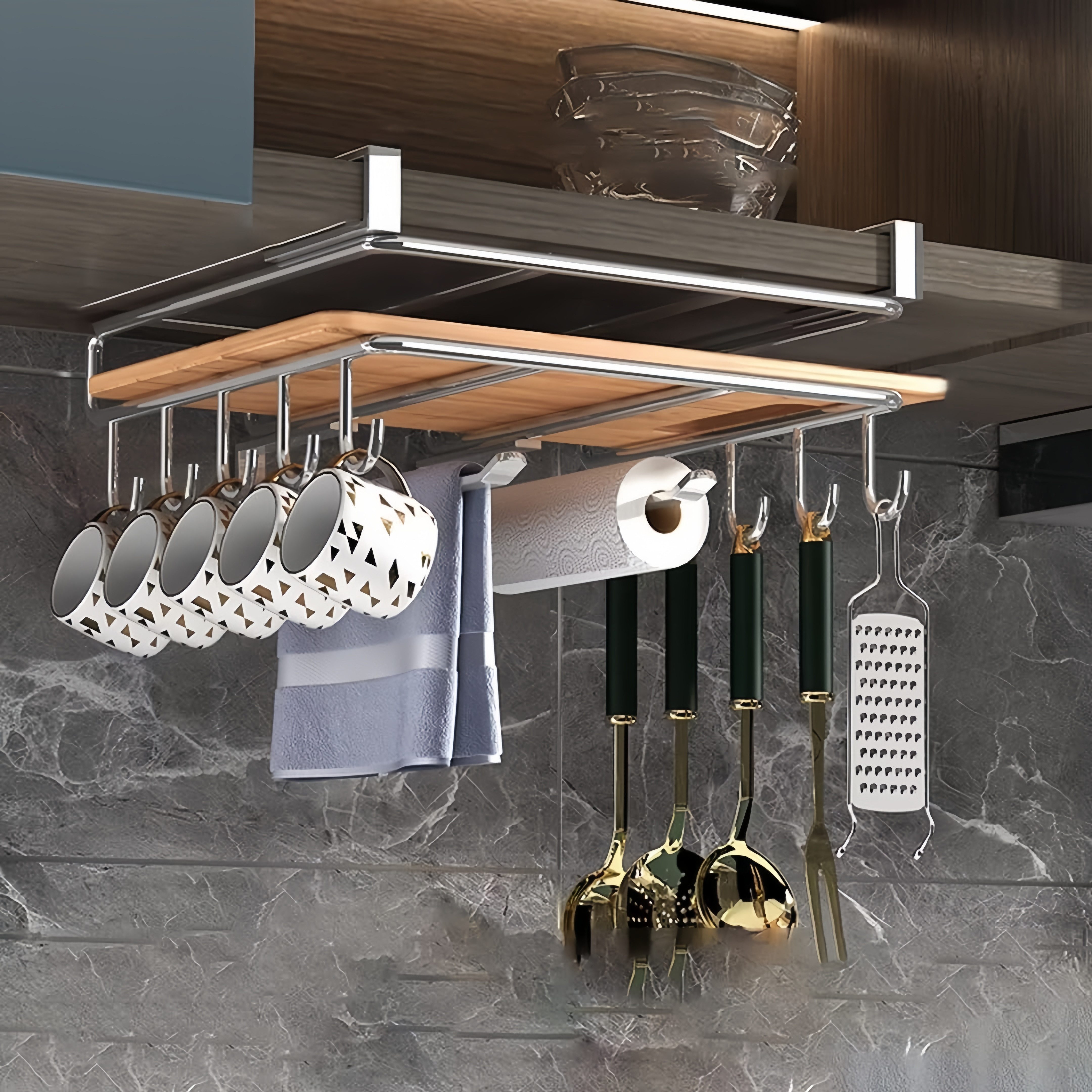 Das einzigartige hängende Design kann sicher im Schrankinneren montiert werden. Es eignet sich nicht nur zur Aufbewahrung von Schneidebrettern, sondern auch für Papierrollen, Tassen, Geschirrhandtücher und Topfdeckel sowie viele andere Küchenutensilien.