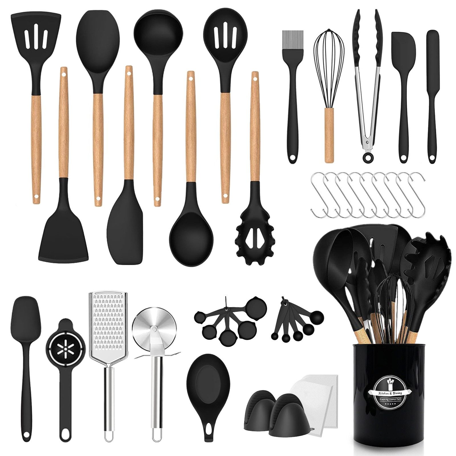 43-teiliges Multifunktionsset: Enthält Spatel, Löffel, Pfannenwender, Suppenkelle, Schneebesen, Küchenzange, Pizzarädchen und mehr – ideal für Braten, Rühren, Kochen, Backen und andere Kochbedürfnisse.