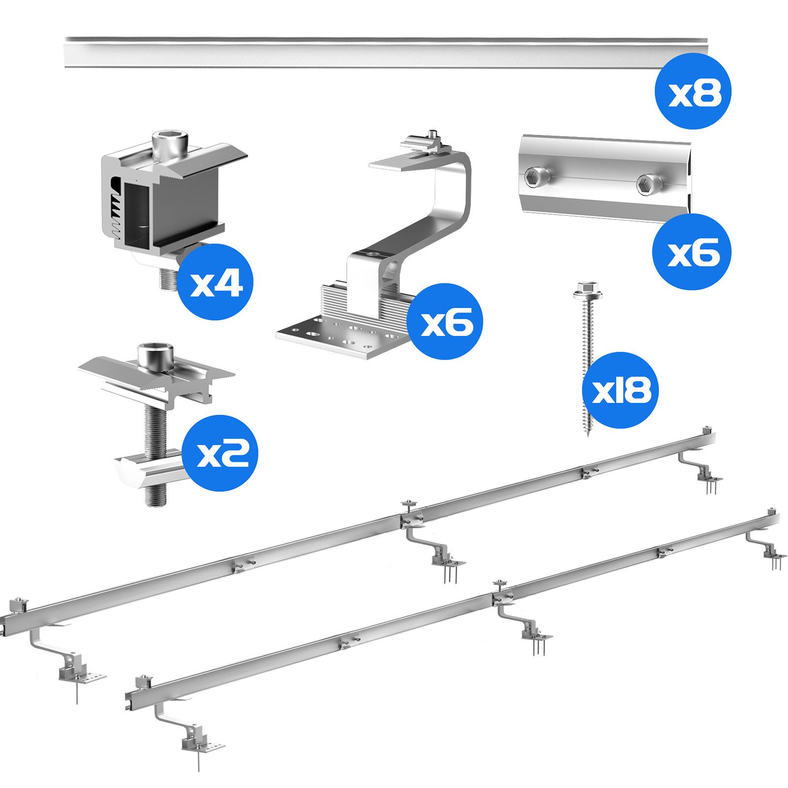 Die Dachhalterung besteht aus acht 615 mm langen Schienen, die zu einer einseitigen Длина von 2460 mm zusammengesetzt werden können. Sie eignet sich für die Installation von zwei 400W bis 550W Solarpanels. Bei der Konstruktion und Herstellung der Photovoltaikhalterung wurden Installationseffizienz und Komfort berücksichtigt. Das modulare Design macht die Installation der Halterung einfacher und schneller.