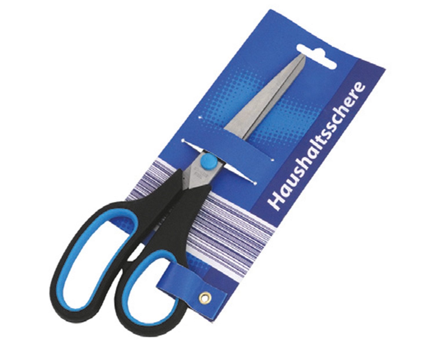 Die **Haushaltsschere** zeichnet sich durch ihre langlebigen Edelstahlklingen aus, die für ihre Schärfe und Korrosionsbeständigkeit bekannt sind. Der ergonomisch geformte Griff sorgt für eine bequeme Handhabung, selbst bei längeren Schneidarbeiten. Mit einer Длина von ca. 21 cm eignet sich die Schere ideal für vielfältige Anwendungen, von Papier und Karton bis hin zu dünnen Stoffen.