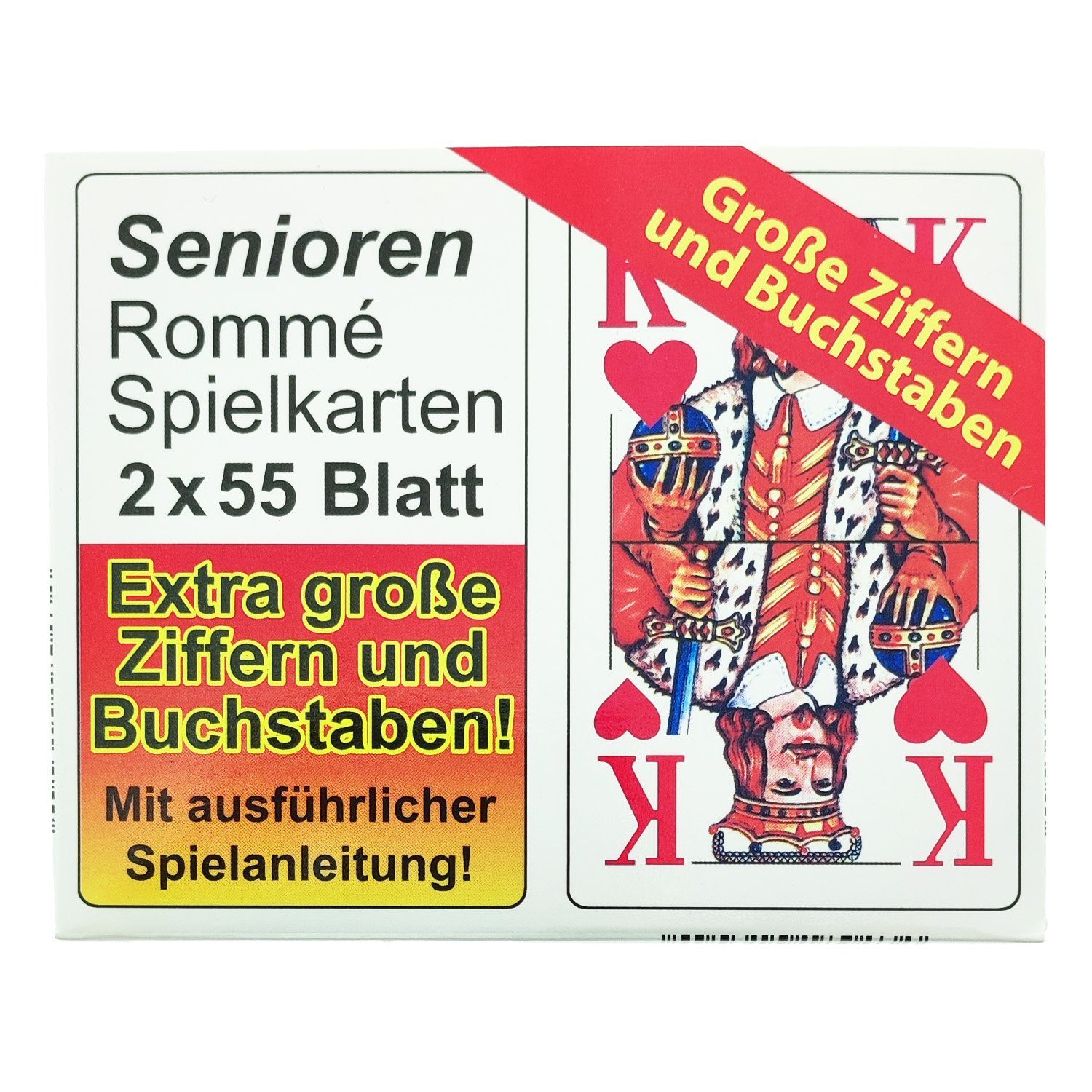 Das Spielkartenset verfügt über extra Große Ziffern und Buchstaben. Ideal für Senioren oder Menschen mit Sehschwäche. Eine ausführliche Spielanleitung liegt mit bei. Die großen Karten haben ebensolchen Eckzeichen. Die Rückseiten der Spielkarten sind blau und rot.