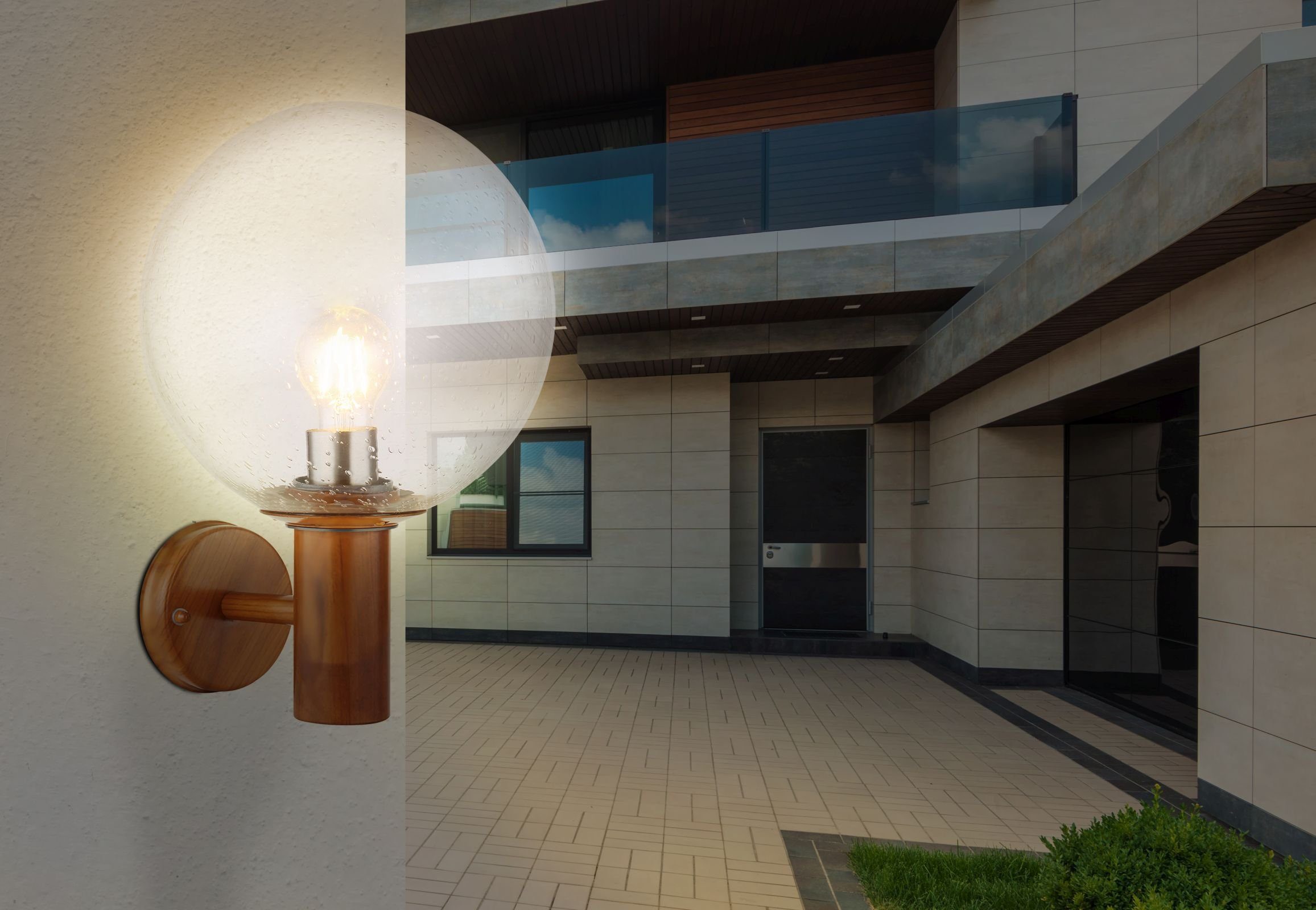 AUßENWANDLEUCHTE - GLASKUGEL - HOLZOPTIK