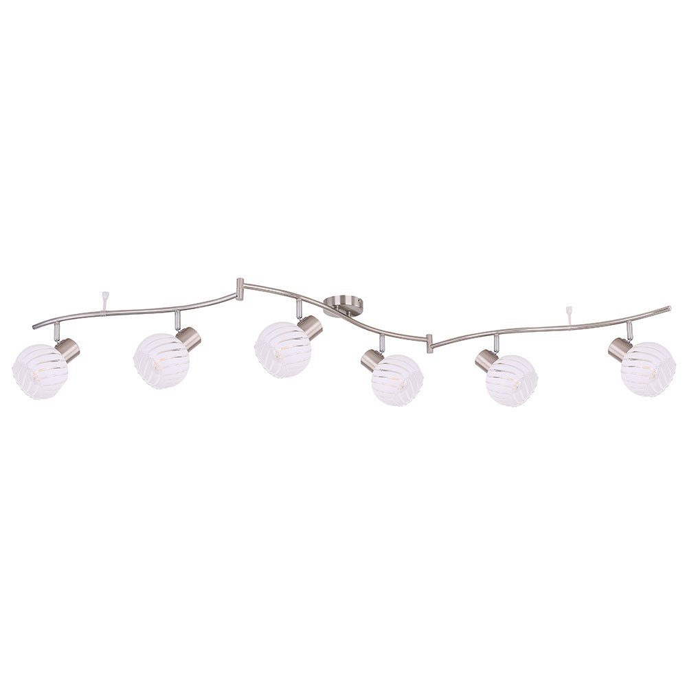 Die Deckenlampe WILLY dieser Produktserie überzeugt durch die Kombination aus Design und Verarbeitung. Die Materialkombination aus nickelmatten Metall und kugelförmigen, gerillt und gestreiften klar-weißen Gläsern sorgen für eine tolle Optik. Die, an einem Spotsystem befestigten Strahler sind mit sechs E27 Fassungen ausgestattet, die es Ihnen ermöglicht das Leuchtmittel selbst zu bestimmen (6 x max.40W) um damit über Lichtstärke und Lichtfarbe zu entscheiden. Mit weiteren Strahlern der gleichen Produktserie können Sie das Bild in Ihren Räumen komplettieren.