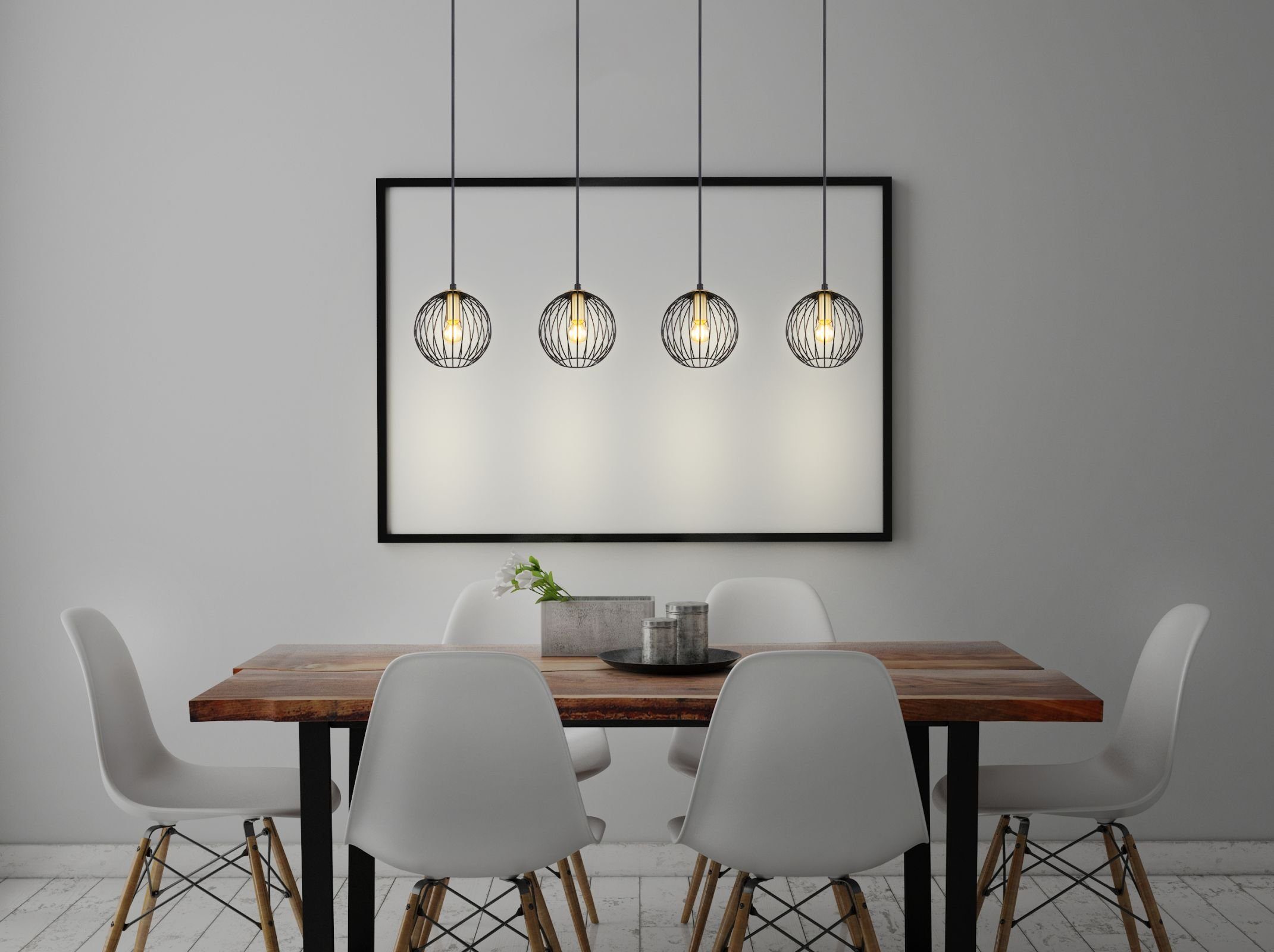 Die Hängeleuchte besteht aus einer schwarzen Metallplatte, an der vier kugelförmige Metallgitterschirme an schwarzen Kabeln hängen.